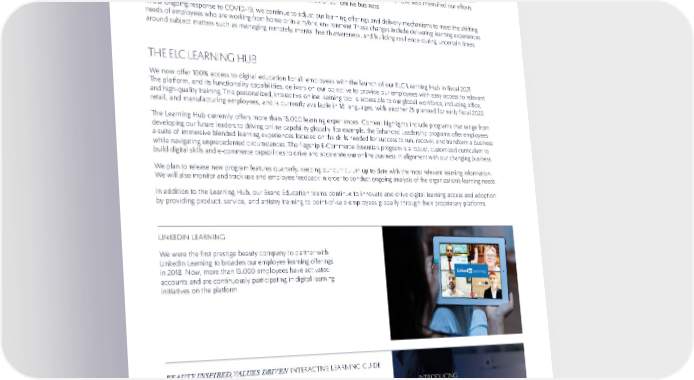 29 SOCIAL IMPACT EMPLOYEE EXPERIENCE OUR APPROACH We utilize a mix of online learning, virtual instructor-led trainings, and, where appropriate, classroom and project experiences, to help employees build core and advanced competencies, while creating value and long-term growth for our company. We couple this with a suite of mentoring opportunities for a 360-degree approach. Our learning and development offerings are created to align with key business objectives. Areas that we have deemed critical to employee success include: data and analytics; digital skills; advanced marketing capability; accelerated omnichannel retail capability; sustainability behaviors; inclusion, diversity, and equity; and people leadership. We have also intensified our efforts to increase digital fluency, which reflects the rising importance of our online business. In our ongoing response to COVID-19, we continue to adjust our learning offerings and delivery mechanisms to meet the shifting needs of employees who are working from home or in a hybrid environment. These changes include delivering learning experiences around subject matters such as managing remotely, mental health awareness, and building resilience during uncertain times. THE ELC LEARNING HUB We now offer 100% access to digital education for all employees with the launch of our ELC Learning Hub in fiscal 2021. The platform, and its functionality capabilities, delivers on our objective to provide our employees with easy access to relevant and high-quality training. This personalized, interactive online learning tool is accessible to our global workforce, including office, retail, and manufacturing employees, and is currently available in 18 languages, with another 25 planned for early fiscal 2022. The Learning Hub currently offers more than 18,000 learning experiences. Content highlights include programs that range from developing our future leaders to driving online capability globally. For example, the Enhanced Leadership programs offer employees a suite of immersive blended learning experiences focused on the skills needed for success to run, recover, and transform a business while navigating unprecedented circumstances. The flagship E-Commerce Essentials program is a robust, customized curriculum to build digital skills and e-commerce capabilities to drive and accelerate our online business in alignment with our changing business. We plan to release new program features quarterly, keeping our curriculum up to date with the most relevant learning information. We will also monitor and track use and employee feedback in order to conduct ongoing analysis of the organization’s learning needs. In addition to the Learning Hub, our Brand Education teams continue to innovate and drive digital learning access and adoption by providing product, service, and artistry training to point-of-sale employees globally through their proprietary platforms. LINKEDIN LEARNING We were the first prestige beauty company to partner with LinkedIn Learning to broaden our employee learning offerings in 2018. Now, more than 13,000 employees have activated accounts and are continuously participating in digital learning initiatives on the platform. BEAUTY INSPIRED, VALUES DRIVEN INTERACTIVE LEARNING GUIDE As social impact and sustainability take on ever-greater importance, we are committed to embedding this work throughout the Company. In November 2020, we launched the Beauty Inspired, Values Driven Interactive Learning Guide, which is accessible to employees globally. The Interactive Learning Guide was designed and custom-built to take employees on a journey of discovery, engagement, and connection. Employees learn about our commitments to social impact and sustainability and can access resources in areas that are of interest to them and explore meaningful ways to get personally involved.