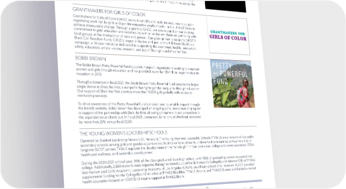 47 SOCIAL IMPACT SOCIAL INVESTMENTS CO-IMPACT Co-Impact is a global philanthropic collaborative supporting initiatives to make systems and societies more just and inclusive so people can live fulfilling lives. ELCCF is an inaugural donor to Co-Impact’s Gender Fund with a multi-year pledge of $3 million per year/$15 million over five years focused on achieving transformative systems change for gender equality, with an emphasis on elevating women’s power, agency, and leadership at all levels. By working in tandem with gender experts, local governments, mission-aligned funders, community leaders, and grassroots programs, the Co-Impact model seeks to transform health, education, and economic systems to achieve equitable and inclusive impact at scale in countries across the Global South. THE YOUNG WOMEN’S LEADERSHIP SCHOOLS Operated by Student Leadership Network (SL Network), The Young Women’s Leadership Schools (TYWLS) are a network of five public secondary schools serving girls and gender-expansive youth of color from primarily underserved communities in New York City. A longtime ELCCF partner, TYWLS supports the development of the “whole girl” in four core areas: college and career awareness, STEM, health and wellness, and leadership development. During the 2020-2021 school year, 99% of the class graduated from high school, with 98% of graduating seniors accepted into college. Additionally, 2,850 students were impacted through renewed support for SL Network’s CollegeBound Initiative (CBI) at TYWLS East Harlem and Girl’s Academic Leadership Academy of Los Angeles (GALA), an affiliate school of SL Network. ELCCF provided supplemental funding for the CollegeBound Initiative at TYWLS Brooklyn, TYWLS Astoria, and TYWLS Queens and funded a mental health counselor focused on COVID-19 trauma support at TYWLS Bronx. GRANTMAKERS FOR GIRLS OF COLOR Grantmakers for Girls of Color (G4GC) works to amplify and mobilize resources to support organizing work led by girls and gender-expansive youth of color in the United States to achieve measurable change. Through a grant to G4GC, we aim to build on our existing commitment to girls’ education and racial equity with an added emphasis on partnering with local groups at the intersection of race and gender. Our grant primarily supports G4GC’S Black Girl Freedom Fund, G4GC’s largest initiative and part of the #1Billion4BlackGirls campaign, a 10-year initiative dedicated to supporting the brain trust, health, innovation, safety, education, artistic visions, research, and joy of Black girls and their families. Now, more than ever, we are depending on partners like The Estée Lauder Companies to help ensure that we are able to continue the support we provide to students. The generosity of the ELCCF allows us to impact the lives of so many well-deserving young women. We are truly grateful for the ELCCF’s steadfast support for the last 18 years—we honestly couldn’t do the work we do without it! YOLONDA MARSHALL Chief Executive Officer , Student Leadership Network “ “ BOBBI BROWN The Bobbi Brown Pretty Powerful Fund supports nonprofit organizations working to empower women and girls through education and has provided more than $1 million in grants since its inception in 2019. Through a donation in fiscal 2021, the Bobbi Brown Pretty Powerful Fund became the largest single donor to She’s the First, a nonprofit that fights gender inequality through education. Our support of She’s the First provides more than 9,000 girls globally with access to mentorship services. To drive awareness of the Pretty Powerful Fund’s mission and to amplify impact through the brand’s website, Bobbi Brown has developed an ongoing consumer donation program in support of the partnership with She’s the First, allowing consumers to add a donation to the organization at check out. In fiscal 2021, consumer donations at checkout increased by more than 25% versus fiscal 2020.