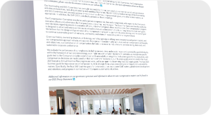 16 OUR COMMITMENT TO SOCIAL IMPACT & SUSTAINABILITY CORPORATE GOVERNANCE AND EXECUTIVE COMPENSATION Our Board of Directors (the “Board”) has developed corporate governance practices to help it fulfill its responsibilities to stockholders to provide general direction and oversight of the management of the Company’s business and affairs. Our Board is led by our Executive Chairman, who is a member of the Lauder family. In addition, we have an independent director who serves as our Presiding Director. A majority of the directors on our Board are independent. As of the end of fiscal 2021, there were 16 directors on our Board, comprising: (i) our CEO; (ii) 11 nonemployee directors (10 of them independent); and (iii) four directors who are members of the Lauder family, including our Executive Chairman. The Board has established the following standing Board committees: the Nominating and ESG Committee; the Compensation Committee, which includes the Stock Plan Subcommittee; and the Audit Committee. For more information about our Board and committees, please visit the Governance section on our website. Our Nominating and ESG Committee has oversight responsibility for our company’s environmental, social, and governance activities and practices, including citizenship and sustainability matters. The SVP GCCS attends meetings of the Nominating and ESG Committee and provides updates on topics such as climate, progress toward goals, and other related matters, as appropriate. In addition, the SVP GCCS periodically presents at Board meetings. Our Compensation Committee establishes and approves compensation plans and arrangements with respect to the Company’s executive officers and administers the Company’s executive annual incentive plan. The Stock Plan Subcommittee has authority over decisions regarding awards to executive officers under the Company’s share incentive plan. Our compensation program is designed to attract and retain world-class talent and to motivate achievement of both our long-term and short-term goals. We believe that the design and governance of our compensation program supports the business strategy and the overall goal to continue sustainable growth of net sales, profitability, and return on invested capital on a long-term basis. Given our history, ownership structure, and strategy, we follow principles of long-term stewardship and patient capital, and our compensation approach reflects and supports this approach. Consistent with our culture and our compensation philosophy and objectives, our combination of compensation elements is intended to help drive and promote strong, balanced, and sustainable corporate performance. We evaluate the performance of our employees, including our executives, under social impact and sustainability goals holistically, within the framework of our corporate strategy, as an input into compensation decisions. In particular, we incorporate specific goals tied to the Company’s broader social impact and sustainability strategy into the business goals for top executives, and compensation decisions are made based on their achievement. For example, such business goals were included in the fiscal 2021 Executive Annual Incentive Plan program and were used as an input into determining fiscal 2021 equity grants. The fiscal 2021 business goals for top executives encompassed multiple strategic focus areas concerning social impact and sustainability matters. Specifically, the fiscal 2021 business goals for certain executives incorporate ID&E matters; global talent development and retention; and progress in connection with Company sustainability objectives. Additional information on our governance practices and information about executive compensation matters can be found in our 2021 Proxy Statement. Our offices in Tokyo, Japan
