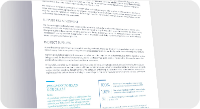 70 SUSTAINABILITY RESPONSIBLE SOURCING SUPPLIER RISK ASSESSMENT We risk-rank suppliers globally based on pre-established criteria, such as the location of the operations, type of material being sourced, and potential impact to our business. Based on the risk ranking of the supplier, we conduct additional due diligence using third-party audits and assessments, including on-site audits. To help us determine country risk, we use a third-party company that assesses each country based on its approaches to social impact and sustainability topics including environment, health and social issues, corruption, and human rights risks. SUPPLIER EVALUATION AND MONITORING We monitor our suppliers to ensure adherence to the Code and pay careful attention to potential risks. We conduct risk assessments and perform due diligence on select direct and indirect suppliers. We also monitor supplier performance and implement corrective action plans as needed. We use EcoVadis, an online ratings service, to help us assess suppliers on environmental impact, labor and human rights, ethics, and sustainable procurement practices. The tool ranks suppliers with numerical scores that reflect the maturity level of their sustainability programs, practices, and initiatives. In fiscal 2021, we rolled out the platform to more than 180 additional suppliers, bringing the total number of direct and indirect suppliers using it to more than 750. We require our key strategic partners to achieve an “advanced” score and expect other suppliers to achieve at least a “satisfactory” score. We engage with suppliers who do not achieve a “satisfactory” score to help them improve, and we reassess them each year until they meet the “satisfactory” requirement. In fiscal 2021, more than half of strategic suppliers improved their EcoVadis scorecard performance from their previous assessment. PROGRESS TOWARD OUR GOALS GOAL: As part of our continuous efforts to address issues that may exist within complex supply chains, by the end of calendar year 2025 we will have identified sensitive ingredient supply chains and developed robust biodi - versity and social action plans for them. We have identified a number of ingredients as priorities and have developed and are implementing biodiversity and social action plans. As part of our ongoing review, we continue to develop and implement action plans as per our prioritization process. More than 90% of our spend with suppliers of sensitive ingredients is covered under EcoVadis, providing enhanced visibility into the environmental and social performance of these suppliers. INDIRECT SUPPLIERS As we deepen our commitment to responsible sourcing, we have furthered our efforts to include our indirect supply chain. Our indirect supply chain is composed of suppliers who sell us goods and services not directly used in the manufacturing of our products. We have extended our supplier risk assessment to include our indirect suppliers and apply criteria such as the type of goods or services being procured, the location of the operations, and the supplier’s annual spend. Based on the risk ranking of the supplier, we conduct additional due diligence using third-party audits and assessments. In fiscal 2021, we rolled out the EcoVadis platform to select indirect suppliers to support evaluation and monitoring. Leveraging our supplier risk assessment, we plan to extend additional invitations to suppliers (both direct and indirect) in the coming years to provide insights into their operations through EcoVadis. We are focused on follow-up and education to help indirect suppliers understand the importance of the tool and the value it brings in establishing a foundation for improving their environmental and social performance. 100% 100% 52 *Suppliers are those that provide direct raw material, ingredient, packaging, and Third-Party Manufacturing to ELC. Figure does not include indirect suppliers. May not include all new suppliers for recently acquired businesses. ** Strategic suppliers include those that are highly critical suppliers with broad and unique capabilities, proven value creation in one or multiple pillars, and highest level of collaborative partnership. These suppliers comprise more than half of ELC direct spend. Figure does not include indirect suppliers. Percentage of new suppliers * screened using environmental and social criteria in fiscal 2021 Percentage of strategic suppliers ** screened using environmental and social criteria in fiscal 2021 Number of third-party on-site supplier audits conducted in fiscal 2021