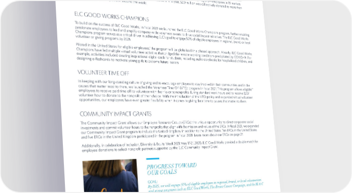 53 SOCIAL IMPACT SOCIAL INVESTMENTS AMPLIFYING EMPLOYEES’ GOOD WORKS As a company with a deep culture of purpose, we provide diverse, inclusive, and personalized employee programs, such as Volunteer Time Off, virtual team volunteer opportunities, and Company matching campaigns to enhance employee experience. We are inspired by the passion our employees show in donating their time and money to causes close to their hearts. That collective generosity of spirit is why we created ELC Good Works, our charitable matching gifts and volunteerism platform that allows eligible employees to create and sign up for volunteer activities, as well as request to have their donations and volunteer hours matched by the Company. In fiscal 2021, ELC Good Works was expanded to include all regions—employees in 19 markets can participate in both volunteering and giving. Over the course of the year, $2.9 million was collectively donated to more than 3,500 nonprofits on the platform around the world. ELC GOOD WORKS CHAMPIONS To build on the success of ELC Good Works, in fiscal 2021 we launched the ELC Good Works Champions program, further enabling passionate employees to lead and amplify company-wide volunteer events to drive social impact initiatives. The ELC Good Works Champions program serves as a critical driver in achieving ELC’s goal to engage 50% of eligible employees in regional, brand, or local volunteer or giving programs by 2025. Piloted in the United States for eligible employees, * the program will be globalized in a phased approach. Already, ELC Good Works Champions have led multiple virtual volunteer activities that bridged the remote working conditions precipitated by COVID-19. For example, activities included creating inspirational digital cards for students, recording audio storybooks for hospitalized children, and designing e-flashcards to motivate young girls to become future leaders. VOLUNTEER TIME OFF In keeping with our long-standing culture of giving and to encourage employees to stay involved in their communities and in the causes that matter most to them, we launched the Volunteer Time Off (VTO) program in fiscal 2021. This program allows eligible ** employees to receive paid time off to volunteer with their favorite nonprofits during standard work hours and to receive $20/ volunteer hour to donate to the nonprofit of their choice. With the introduction of the VTO policy and expanded virtual volunteer opportunities, our employees have even greater flexibility when it comes to giving their time to causes that matter to them. COMMUNITY IMPACT GRANTS The Community Impact Grant allows our Employee Resource Groups (ERGs) the unique opportunity to direct corporate social investments and commit volunteer hours to the nonprofits that align with the mission and values of the ERGs. In fiscal 2021, we expanded our Community Impact Grant program to include the United Kingdom, in addition to the United States. Ten ERGs in the United States and five ERGs in the United Kingdom participated in the program in fiscal 2021. Learn more about our ERGs on page 27. Additionally, in celebration of Inclusion, Diversity & Equity Week 2021 (May 17-21, 2021), ELC Good Works provided a double match for employee donations to select nonprofit partners supported by the ELC Community Impact Grant. * Any traditionally NYC-based full-time or part-time regular employee in good standing. **Active U.S.-based full-time regular corporate employees can utilize up to 16 VTO hours per calendar year. Active U.S.-based part-time regular corporate employees and active U.S. full-time regular and part-time regular Aveda retail and supply chain employees can utilize up to eight VTO hours per calendar year. PROGRESS TOWARD OUR GOALS GOAL: By 2025, we will engage 50% of eligible employees in regional, brand, or local volunteerism and giving programs such as ELC Good Works, The Breast Cancer Campaign, and the M·A·C Global Volunteer program. In fiscal 2021, 19% of eligible employees participated in volunteerism and giving programs as recorded via the ELC Good Works platform. * *Metric reflects information self-reported to ELC Good Works, the Company’s internal platform used to report employee volunteerism, employee monetary donations, and ELC charitable matching gifts. In September 2020 (fiscal 2021), ELC Good Works expanded to 17 markets outside the U.S. and the U.K. At the end of fiscal 2021, ELC Good Works was available to eligible employees in 19 markets globally. “Eligible employees” are those who meet certain criteria, which varies by market, and have access to ELC Good Works. Excludes brands acquired by ELC during or after fiscal 2020. For additional information, see Management Assertion.