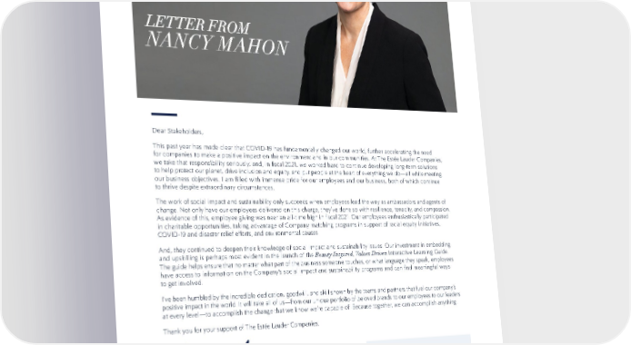 11 LEADERSHIP LETTERS Dear Stakeholders, This past year has made clear that COVID-19 has fundamentally changed our world, further accelerating the need for companies to make a positive impact on the environment and in our communities. At The Estée Lauder Companies, we take that responsibility seriously, and, in fiscal 2021, we worked hard to continue developing long-term solutions to help protect our planet, drive inclusion and equity, and put people at the heart of everything we do—all while meeting our business objectives. I am filled with immense pride for our employees and our business, both of which continue to thrive despite extraordinary circumstances. The work of social impact and sustainability only succeeds when employees lead the way as ambassadors and agents of change. Not only have our employees delivered on this charge, they’ve done so with resilience, tenacity, and compassion. As evidence of this, employee giving was near an all-time high in fiscal 2021. Our employees enthusiastically participated in charitable opportunities, taking advantage of Company matching programs in support of racial equity initiatives, COVID-19 and disaster relief efforts, and environmental causes. And, they continued to deepen their knowledge of social impact and sustainability issues. Our investment in embedding and upskilling is perhaps most evident in the launch of the Beauty Inspired, Values Driven Interactive Learning Guide. The guide helps ensure that no matter what part of the business someone touches, or what language they speak, employees have access to information on the Company’s social impact and sustainability programs and can find meaningful ways to get involved. I’ve been humbled by the incredible dedication, goodwill, and skill shown by the teams and partners that fuel our company’s positive impact in the world. It will take all of us—from our unique portfolio of beloved brands to our employees to our leaders at every level—to accomplish the change that we know we’re capable of. Because together, we can accomplish anything. Thank you for your support of The Estée Lauder Companies. NANCY MAHON Senior Vice President, Global Corporate Citizenship and Sustainability The Estée Lauder Companies Inc. NANCY MAHON NANCY MAHON LETTER FROM LETTER FROM In fiscal 2021, we continued to support our employees facing financial hardships due to COVID-19 through further contributions to the ELC Cares Employee Relief Fund, which was started at the beginning of the pandemic.
