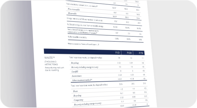 104 FY21 FY21 FY20 FY20 FY19 FY19 ENERGY (THOUSAND MWH) Amounts may not sum due to rounding Total energy consumption within the organization 20 289.6 * 289.0 299.3 Total fuel consumption, by source 21 128.7 * 129.8 1 3 7.9 Non-renewable 1 23.9 * 128.4 136.8 Renewable 4.8 * 1.6 1.1 Total electricity consumption, by source 22 160.9 * 1 59.2 161.4 Non-renewable 0.0 * 0.0 54.8 Renewable 160.9 * 1 59.2 106.6 Energy intensity (MWh normalized to net sales) 1 7.9 * 20.2 20.1 % Global energy sourced from renewable energy 57.2% * 55.6% 36.0% Reduction of energy consumption due to conservation and efficiency measures 19 5.0 * 2.3 2.6 % Renewable electricity 100% 100% 66% FY21 FY21 FY20 FY20 FY19 FY19 WASTE 23 (THOUSAND METRIC TONS) Amounts may not sum due to rounding Total hazardous waste, by disposal method 1.4 1.3 1.1 Recycling 0.02 0.01 n/a Recovery, including energy recovery 1.3 1.3 n/a Landfill 0 0 n/a Incineration 0.03 0.01 n/a Other treatment method 24 <0.01 <0.01 n/a Total non-hazardous waste, by disposal method 30.8 29.5 31.0 Reuse 4.3 4.4 4.5 Recycling 14.7 15.1 1 7. 0 Composting 0.02 0.03 0.01 Recovery, including energy recovery 11.7 9.9 9.5 Landfill 25 <0.01 <0.01 0 20. Excludes brands acquired by ELC during or after fiscal 2021. For additional information, see Management Assertion. 21. Fuel consumption for all global activities with ELC operational control. Non-renewable fuel includes natural gas, mobile gasoline, mobile diesel, fuel oil, and purchased steam. Renewable fuel includes on-site solar generated and consumed at ELC locations, bio-fuel, and district heating from wood and wood residuals. Fiscal 2020 renewable fuel value restated due to more accurate data capture. 22. Electricity consumption for all global activities with ELC operational control. Non-renewable electricity consumption reflects utility purchases not covered by off-site generation (utility contracts), Energy Attribute Certificates (EACs), and a Virtual Power Purchase Agreement (VPPA). Renewable electricity consumption reflects off-site generation (utility contracts), EACs, and a VPPA. 23. Waste data reflects production and excess obsolete (EXOB) from 39 primary locations (15 manufacturing sites, 20 distributions sites, and 4 innovation sites); data does not include 17 additional sites that are included in the zero industrial waste-to-landfill goal. Sludge waste and product giveaways are not included. Disposal information is provided by the waste disposal contractors except for reuse, which is carried out by ELC. Adjustment made to fiscal 2020 and fiscal 2019 ‘Total hazardous waste (Recovery, including energy recovery)’ and ‘Total non-hazardous waste (Recycling)’ metrics to reflect waste reclassification. Combined ‘Total hazardous waste’ and ‘Total non-hazardous waste’ amount remains the same. Excludes brands acquired by ELC during or after fiscal 2020. 24. Other treatment methods include wastewater treatment, chemical treatment, and reuse. 25. Metric includes Municipal Solid Waste (MSW), a non-industrial waste stream that is not part of the scope of ELC’s zero industrial waste-to-landfill goal. *Metrics assured by PricewaterhouseCoopers LLP METRICS