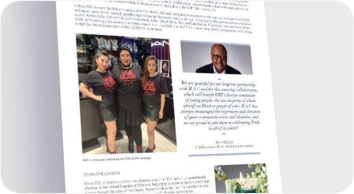 50 SOCIAL IMPACT SOCIAL INVESTMENTS HEALTH In addition to our long-standing commitment to ending breast cancer, our brands are leveraging their power and reach to drive progress on health issues that matter to them and their consumers, making significant impacts in the fight against HIV/AIDS and mental illness. M·A·C VIVA GLAM The trailblazing M·A·C VIVA GLAM campaign has raised more than $500 million in support of people and communities in need since it was launched in 1994. Through this program, 100% of the selling price of VIVA GLAM lipstick products go to organizations that are working to provide assistance to people living with and affected by HIV/AIDS and to promote healthy futures and equal rights for all. In recent years, M·A·C has increased efforts to focus on women and girls and the LGBTQIA+ community. In fiscal 2021, to mark the 26th anniversary of M·A·C VIVA GLAM and create greater awareness for the ongoing challenges of HIV/AIDS and equal rights, M·A·C teamed up with singer-songwriter Rosalía to create a red lipstick inspired by the Grammy-winner’s flamenco sound. Additionally, tied to Pride 2021 celebrations in the United States, the brand launched an 11-shade eye liner assortment where 100% of the selling price went to the Hetrick-Martin Institute (HMI), one of M·A·C’s long-standing VIVA GLAM partners, which helps to fight for the empowerment of the LGBTQIA+ community. JO MALONE LONDON Since 2012, Jo Malone London has donated more than $3.4 million to mental health charities in the United Kingdom and Ireland, helping to raise awareness and stamp out stigmas through the sales of the Charity Home Candle collection. The collection is now four candles strong, enabling the brand to support 11 charities in the region. In fiscal 2021, coinciding with Mental Health Awareness Month, the brand extended its support for mental health to the United States with the launch of its White Lilac & Rhubarb Charity Home Candle. For each candle sold in the United States, Jo Malone London donates 70% of the purchase price to Fountain House, a leading mental health nonprofit organization, in support of the growth and expansion of its youth initiative and College Re-entry program. This program is designed for academically engaged 18- to 30-year-old students who, having withdrawn from their studies due to mental health issues, are given the tools they need to return to college and successfully achieve their educational goals. We are grateful for our longtime partnership with M·A·C and for this amazing collaboration, which will benefit HMI’s diverse community of young people, the vast majority of whom identify as Black or people of color. M·A·C has always encouraged the expression and elevation of queer community voices and identities, and we are proud to join them in celebrating Pride in all of its colors! JOE PRESSLEY Chief Executive Officer, Hetrick-Martin Institute “ “ M·A·C employees celebrating the VIVA GLAM campaign