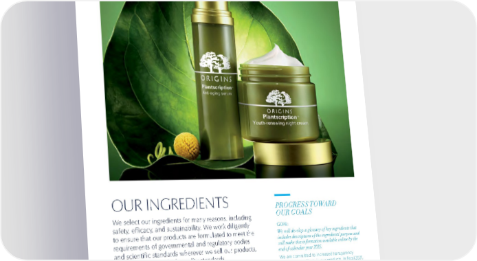 84 SUSTAINABILITY PRODUCT FORMULATION OUR INGREDIENTS We select our ingredients for many reasons, including safety, efficacy, and sustainability. We work diligently to ensure that our products are formulated to meet the requirements of governmental and regulatory bodies and scientific standards wherever we sell our products, as well as our own high-quality standards. We achieve these high-quality and safety standards through rigorous selection and evaluation of the ingredients that we use in our formulations and through careful consideration of what we don’t use, even if permitted by regulatory authorities. We are confident in the safety and efficacy of our products and the ingredients we use. PROGRESS TOWARD OUR GOALS GOAL: We will develop a glossary of key ingredients that includes descriptions of the ingredients’ purpose and will make this information available online by the end of calendar year 2025. We are committed to increased transparency about the ingredients in our products. In fiscal 2021, seven brands—Bobbi Brown, Bumble & bumble, Estée Lauder, Editions de Parfums Frédéric Malle, GlamGlow, M·A·C, and Smashbox—published ingredient glossaries on their websites, bringing our total to 11 (Aveda, Origins, Clinique, and La Mer released ingredient glossaries in fiscal 2020).