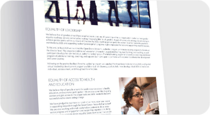 40 SOCIAL IMPACT INCLUSION, DIVERSITY & EQUITY EQUALITY OF LEADERSHIP We believe that all genders should have equal access to positions of leadership within our organization. Under our new gender equality roadmap, we are committed to leveling the playing field for all genders. As part of our equality strategy, we are aiming to achieve gender parity within our Board of Directors by 2025; reaching gender parity for women in senior leadership positions worldwide by 2025; and expanding leadership development programs to give employees the tools and support they need for success. To this end, in fiscal 2021 we launched the Open Doors Women’s Leadership program, an intensive training program for females at the director level. The program combines self-assessment, instruction, experiential learning, team building, and coaching, as each participant develops her own individual, authentic leadership style. The initial training program is followed by a year-long enrichment program of additional training, coaching, and support. Each participant is partnered with a sponsor to enhance her development and career journey. Following on the positive feedback from the Leadership program, we launched The Open Doors Collection in July 2021, a self-guided virtual leadership development program available to all employees globally to help them develop critical skills to lead as an individual, across a team, and throughout the enterprise. EQUALITY OF ACCESS TO HEALTH AND EDUCATION We believe that all people around the world deserve access to health, education, and economic participation. We are also committed to giving women and girls access to the proper tools and skills needed to become successful and to create lasting change. We have pledged to maintain our position as the number one leader in supporting research through the Breast Cancer Research Foundation ® . We are also working with multi-stakeholder partners to drive cross- sector progress and engagement and supporting organizations doing critical work to promote gender equality. Learn more about how we are collaborating with others to address health and education disparities in our Social Investments section on page 42. Finally, we will leverage our platform and use our voice to connect with and empower the next generation of women leaders. We commit to taking steps to galvanize future leaders, including among our thousands of employees and millions of consumers, to advance the voices of the next generation and to be agents of positive change for women around the world. Jill Bargonetti, PhD. Hesselbach Professor of Biological Sciences and Chair of PhD Program in Molecular Cellular and Developmental Biology at The City University of New York at Hunter College and The Graduate Center. Recipient of The Estée Lauder Companies’ Brands Awards in Memory of Evelyn H. Lauder through the Breast Cancer Research Foundation.
