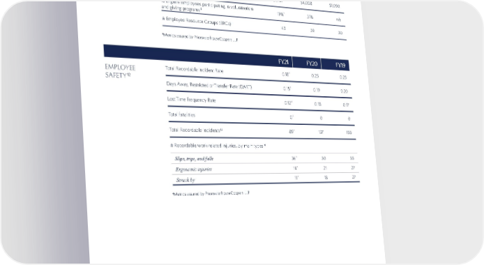 102 FY21 FY21 FY20 FY20 FY19 FY19 EMPLOYEE SAFETY 12 Total Recordable Incident Rate 0.18 * 0.23 0.25 Days Away, Restricted or Transfer Rate (DART) 0.15 * 0.19 0.20 Lost Time Frequency Rate 0.12 * 0.18 0.17 Total fatalities 0 * 0 0 Total Recordable Incidents 13 89 * 137 155 # Recordable work-related injuries, by main types 14 Slips, trips, and falls 36 * 50 55 Ergonomic injuries 14 * 21 27 Struck by 11 * 18 27 8. Metrics reflect information self-reported to ELC Good Works, the Company’s internal platform used to report employee volunteerism, employee monetary donations, and ELC charitable matching gifts. In September 2020 (fiscal 2021), ELC Good Works expanded to 17 markets outside the United States and the United Kingdom. At the end of fiscal 2021, ELC Good Works was available to eligible employees in 19 markets globally. “Eligible employees” are those who meet certain criteria, which varies by market, and have access to ELC Good Works. Excludes brands acquired by ELC during or after fiscal 2020. For additional information, see Management Assertion. 9. In fiscal 2021, the COVID-19 pandemic continued to negatively impact volunteerism rates due to restrictions on assembly. 10. Due to campaigns that provide more than a 1-to-1 match, amount matched by ELC is higher than employee donation amount. ELC match amount is also included as part of the “Total Charitable Contributions” metric in the Social Investments data table. In fiscal 2020, an additional $3 million in ELC match was allocated to facilitate a 5-to-1 match campaign as part of the Company’s racial equity commitments. 11. Total number includes all global chapters, representing 19 unique ERGs. 12. Metrics includes employees and contractors under direct supervision. Breakdown by direct employees and contractors is not available. Rates are calculated using OSHA recordability criteria and are based on 200,000 hours worked and the ELC Total Hours Worked for the fiscal year. The ELC Total Hours Worked for fiscal 2021 was approximately 100 million hours. Excludes brands acquired by ELC during or after fiscal 2020. For additional information, see Management Assertion. 13. Recordable Incidents are measured using OSHA recordability criteria. 14. Main types include the top three most frequently occurring types of recordable injuries as observed over a five-year lookback period. FY21 FY21 FY20 FY20 FY19 FY19 EMPLOYEE ENGAGEMENT (THOUSANDS, EXCEPT ERGS) Employee volunteer hours 8 9 12.8 * 1 7. 1 26.0 Employee donations $1,234 * $1,541 $798 Amount matched by ELC 8 10 $1,721 * $4,008 $1,090 % Eligible employees participating in volunteerism and giving programs 8 19% * 31% n/a # Employee Resource Groups (ERGs) 11 43 39 30 *Metrics assured by PricewaterhouseCoopers LLP *Metrics assured by PricewaterhouseCoopers LLP METRICS