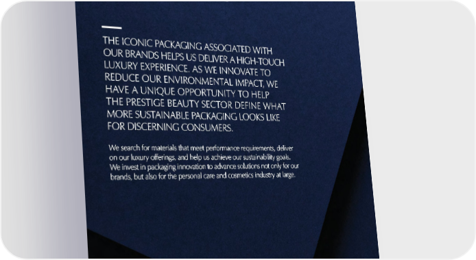 86 SUSTAINABILITY PACKAGING 86 PACKAGING THE ICONIC PACKAGING ASSOCIATED WITH THE ICONIC PACKAGING ASSOCIATED WITH OUR BRANDS HELPS US DELIVER A HIGH-TOUCH OUR BRANDS HELPS US DELIVER A HIGH-TOUCH LUXURY EXPERIENCE. AS WE INNOVATE TO LUXURY EXPERIENCE. AS WE INNOVATE TO REDUCE OUR ENVIRONMENTAL IMPACT, WE REDUCE OUR ENVIRONMENTAL IMPACT, WE HAVE A UNIQUE OPPORTUNITY TO HELP HAVE A UNIQUE OPPORTUNITY TO HELP THE PRESTIGE BEAUTY SECTOR DEFINE WHAT THE PRESTIGE BEAUTY SECTOR DEFINE WHAT MORE SUSTAINABLE PACKAGING LOOKS LIKE MORE SUSTAINABLE PACKAGING LOOKS LIKE FOR DISCERNING CONSUMERS. FOR DISCERNING CONSUMERS. We search for materials that meet performance requirements, deliver We search for materials that meet performance requirements, deliver on our luxury offerings, and help us achieve our sustainability goals. on our luxury offerings, and help us achieve our sustainability goals. We invest in packaging innovation to advance solutions not only for our We invest in packaging innovation to advance solutions not only for our brands, but also for the personal care and cosmetics industry at large. brands, but also for the personal care and cosmetics industry at large. SUSTAINABILITY