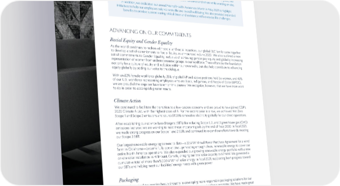 9 LEADERSHIP LETTERS ADVANCING ON OUR COMMITMENTS Racial Equity and Gender Equality As the world continues to reckon with social and racial injustices, our global ELC family came together to develop a set of commitments to Racial Equity, as announced in June 2020. We also outlined a new set of commitments to Gender Equality, inclusive of achieving gender pay equity and globally increasing representation of women from underrepresented groups in our workforce. These efforts lay the foundation not only for a culture of equity and inclusion within our own walls, but also help contribute to advancing equity globally by adding our voice to the dialogue. With an 82% female workforce globally, 55% of global VP and above positions held by women, and 46% of our U.S. workforce representing employees who are Black, Indigenous, and People of Color (BIPOC), we are proud of the steps we have taken on this journey. We recognize, however, that we have more work to do in order to accomplish greater results. Climate Action We continued to facilitate the transition to a low-carbon economy and are proud to have joined CDP’s 2020 Climate A List, with the highest score of A. For the second year in a row, we achieved Net Zero Scope 1 and Scope 2 emissions and sourced 100% renewable electricity globally for our direct operations. After establishing our science based targets (SBTs) for reducing Scope 1, 2, and 3 greenhouse gas (GHG) emissions last year, we are working to meet these important goals by the end of fiscal 2030. In fiscal 2021, we made strong progress on our Scope 1 and 2 SBTs and continued to expand our efforts towards meeting our Scope 3 SBT. Our largest renewable energy agreement to date—a 22 MW Virtual Power Purchase Agreement for a wind farm in Oklahoma—became fully operational, generating enough clean, renewable energy to cover our entire North America operations. We also expanded our growing renewable energy portfolio with a new on-site solar installation in Hillmount, Canada, bringing our total solar capacity to 5.7 MW. We generated a cumulative total of more than 5,000 MWh of solar energy in fiscal 2021, supporting both progress toward our SBTs and helping meet our facilities’ energy needs with green power. Packaging We aspire to lead the prestige beauty industry in developing more responsible packaging solutions for our consumers and to help drive innovation toward the goal of a circular plastic economy. We have made great strides to increase the amount of post-consumer recycled (PCR) material in our packaging. In fiscal 2021, we achieved our 2025 PCR goal years ahead of schedule, reaching 15% PCR material in our packaging. We have now established a new, more ambitious target for PCR: By 2025, we will increase the amount of PCR material in our packaging to 25% or more. And, recognizing the increasing need to address the use of virgin plastic, we have set a goal to reduce the amount of virgin petroleum plastic in our packaging to 50% or less by 2030. We are especially grateful to our employees’ agility, focus, and persistence in helping drive progress on our sustainability and social impact goals and inclusion, diversity, and equity commitments, all while caring for each other, their families, and our company with compassion, creativity, and resolve. From the start of the COVID-19 pandemic, we adjusted our operations and developed global protocols to protect the health and safety of our people and our consumers. For example, across the globe, our employees used more than five million masks to protect themselves and others while working on-site. In addition, we dedicated our annual Mental Health Awareness Month in May 2021 to highlight initiatives to help our employees balance work-life and overall well-being. We also provided expanded benefits to provide support during critical times and assistance with everyday life challenges.