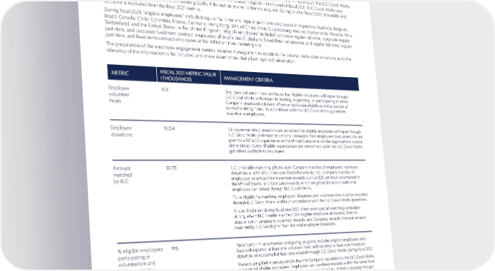 120 INDEPENDENT ASSURANCE STATEMENTS METRIC METRIC FISCAL 2021 METRIC VALUE FISCAL 2021 METRIC VALUE (THOUSANDS) (THOUSANDS) MANAGEMENT CRITERIA MANAGEMENT CRITERIA Employee volunteer hours 12.8 Employee volunteer hours are hours that eligible employees self-report through ELC Good Works with regard to leading, organizing, or participating in either Company-organized volunteer efforts or individual eligible activities outside of normal working hours, in accordance with the ELC Good Works guidelines available to employees. Employee donations $1,234 Employee monetary donations are donations that eligible employees self-report through ELC Good Works and must be personal donations from employees’ own assets that are given to a 501(c)(3) organization in the United States or to similar organizations outside of the United States. Eligible organizations are determined under the ELC Good Works guidelines available to employees. Amount matched by ELC $1,721 ELC charitable matching gifts include: Company matches of employees’ monetary donations at a 1:1 ratio unless specified otherwise by ELC; Company matches of employees’ volunteer time (volunteer rewards such as $20 per hour volunteered in the United States); and Company rewards which are gifted donation credits that employees can donate through ELC Good Works. To be eligible for matching, employees’ donations and volunteer time must be recorded through ELC Good Works and be in accordance with the ELC Good Works guidelines. At specified times during fiscal year 2021, there were special matching campaigns during which ELC double matched (2x) eligible employee donations. Due to double match campaigns, volunteer rewards, and Company rewards, the total amount matched by ELC was higher than the total employee donations. % eligible employees participating in volunteerism and giving programs (as of June 30, 2021) 19% Participation in volunteerism and giving programs includes eligible employees who have self-reported at least one volunteer hour, self-reported at least one monetary donation, or redeemed at least one reward through ELC Good Works during fiscal 2021. Rewards are gifted monetary credits that the Company has added to the ELC Good Works accounts of eligible employees. Employees can use these rewards within the same fiscal year as they were gifted to make donations to organizations of their choosing through ELC Good Works. EMPLOYEE ENGAGEMENT ELC Good Works is the Company’s internal platform used to report employee volunteerism, employee monetary donations, and ELC charitable matching gifts. The ELC Good Works guidelines outline program eligibility, criteria, and terms and conditions, as adapted to meet local requirements. Metrics reflect information self-reported to ELC Good Works by eligible employees during fiscal 2021. In fiscal 2021, the ELC Good Works platform expanded to 17 markets outside the United States and the United Kingdom. At the end of fiscal 2021, ELC Good Works was available to eligible employees in 19 markets globally. Information related to brands acquired during or after fiscal 2020 (Have&Be and DECIEM) is excluded from the fiscal 2021 metrics. During fiscal 2021, “eligible employees” included regular full-time and regular part-time employees in Argentina; Australia; Belgium; Brazil; Canada; Chile; Colombia; France; Germany; Hong Kong, SAR of China; India; Luxembourg; Mexico; Netherlands; Panama; Peru; Switzerland; and the United States. In the United Kingdom, “eligible employees” included corporate regular full-time, corporate regular part-time, and corporate fixed-term contract employees; all Jo Malone Global and Travel Retail employees; and regular full-time, regular part-time, and fixed-term contract employees at the Whitman manufacturing site. The preparation of the employee engagement metrics requires management to establish the criteria, make determinations as to the relevancy of the information to be included, and make assumptions that affect reported information.