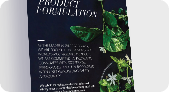 78 SUSTAINABILITY PRODUCT FORMULATION 78 78 We uphold the highest standards for safety and We uphold the highest standards for safety and efficacy in our products, while incorporating sustainable efficacy in our products, while incorporating sustainable practices across our formulation processes. practices across our formulation processes. PRODUCT FORMULATION AS THE LEADER IN PRESTIGE BEAUTY, WE ARE FOCUSED ON CREATING THE WORLD’S MOST-BELOVED PRODUCTS. WE ARE COMMITTED TO PROVIDING CONSUMERS WITH EXCEPTIONAL PERFORMANCE AND LUXURY COUPLED WITH UNCOMPROMISING SAFETY AND QUALITY. SUSTAINABILITY