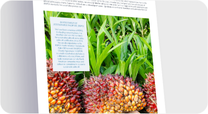 74 SUSTAINABILITY RESPONSIBLE SOURCING PALM OIL Palm oil derivatives are an important ingredient used in many of our formulations. Palm oil derivatives refer to the final ingredients created from palm oil that are used in our products, such as surfactants, emulsifiers, and emollients. They are odorless, with a smooth and creamy texture that makes them a beneficial ingredient to use in our formulations. In calendar year 2020, we purchased approximately 3,600 metric tons of palm oil-based derivatives, which represent less than 0.01% of the world’s annual production of palm oil-based derivatives. While this amount makes us a comparatively low-volume user of palm-based ingredients relative to other sectors, we are committed to taking concrete action with our suppliers to build sustainable and ethical palm supply chains. Currently, 100% of our purchased palm-based ingredients are certified to Roundtable on Sustainable Palm Oil (RSPO) standards for sustainable production * . ROUNDTABLE ON SUSTAINABLE PALM OIL (RSPO) We have been a member of RSPO, the leading convening body that develops and sets the standards for sustainable palm oil and enables palm oil certification, since 2014. We are also signatories to the RSPO’s North American Sustainable Palm Oil Network (NASPON) Charter Agreement. NASPON is a multi-stakeholder platform to collaborate, educate, inform, and build momentum to help North American companies make and deliver on commitments to source sustainable palm oil. *Excludes palm-based ingredients not directly procured by The Estée Lauder Companies, such as those procured by Third-Party Manufacturers.