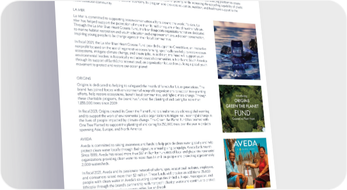 51 SOCIAL IMPACT SOCIAL INVESTMENTS ENVIRONMENT We strive to reduce our environmental impacts and address the risks presented by climate change. Our social investments and brand engagement efforts in this area amplify our work to help protect the planet and raise awareness about important environmental issues. PLASTICS FOR CHANGE Through an ELCCF grant to Plastics for Change, we seek to enhance livelihoods for waste collectors in India, the majority of whom are women, while diverting plastics from the ocean. Plastics for Change has developed an innovative ethical sourcing platform to create dignified, sustainable livelihoods for the urban poor and break the cycle of poverty, while increasing the upcycling capability of plastic and moving the industry toward a circular economy. Its program also provides education, nutrition, and healthcare support to the waste-collector community. LA MER La Mer is commit ted to supporting ocean conservation efforts around the w orld. To date, La Mer has helped support t he p rotection of more than 16 million square mile s of marine habitats. Through t he L a M er B lue H eart O ceans F und, t he brand suppor ts organiz ations that ar e dedicated to marin e habita t restoration and youth education and empowerment around ocean conservation, inspiring young people to be ch ange agents in their local communities. I n fiscal 2021, the La Mer Blue Heart Oceans Fu nd provided s upp ort to GreenWave, an innovative nonprofit focused on the use of regenerative ocean farming, specifically sea kelp, to restore ocean ec osystems, mitigate climate change, and c reat e jobs. In addition, the Fun d wi ll support youth environmental le aders in historic ally excluded coast al communitie s in North and South America throu gh its support of EarthEcho Internationa l, an organization focu sed on building a gl obal youth movement to prote ct and restore our ocean planet. ORIGINS O rigins is dedica ted to helping to saf eguard the hea lth o f forests for future generations. The brand has joined forces with environmental nonpro fit organizations to sup port tree-planti ng efforts, help restore ecosystems, benefit local communities, and fight climate change. Through these charitable programs, the brand has funde d the p lanting of and caring for more than 1 ,855,000 trees since 2009. In fiscal 2021, Origins created its Green the Planet Fund to sim ulta neously address global warming and to support the work of environmental justice organizat ions to tr igger real, meaningful change i n the lives of people impacted by c limate change. The Gree n the Planet Fund has teamed wit h One T ree Planted to support the planting of and caring for 250,000 trees over the year in projects s panning Asia, Europe, and North America. A VEDA Aveda is committed to raising awareness and funds to help provide clean water globally and help pro tect clean water locally through their signature ann ual giving campaign, Aveda Earth Month. Si nce 1999, Aveda has raised more than $67 million for h undreds of local and global environmental organizations providing clean water to more than 1.4 million people and protecting approximately 2,000 watersheds. In fisc al 20 21, Aveda and its passionate network of salons , spas, edu cational institutes, employees, a nd consumers raised more than $ 2 million. These funds will provi de an ad ditional 35,000 pe ople with clean water in Aveda’s sourcing commun ities in India, Nepal, Madagas car, and Ethiopia through the brand’s partnership with nonpr ofit charity: water an d continue to p rotect local watersheds where these communities live and work. RAINFORE ST ALLIANCE / SUPPORTING EQUITABLE SOLUTIONS TO CLIMATE CHANGE As a Beauty Inspired, Values Driven company, we put our values into action every day across our entire business to better people and the planet. Thr oughout Earth Month, we asked our employees to help us raise funds for the Rainforest Alliance by sharing how they are BEAUTY INSPIRED, VALUES DRIVEN . Thanks to the efforts of our global ELC family and in honor of our 75th anniversary, we donated $75,000 to the Rainforest Alliance’s global gender equality work, which engages women in sustainable climate solutions.