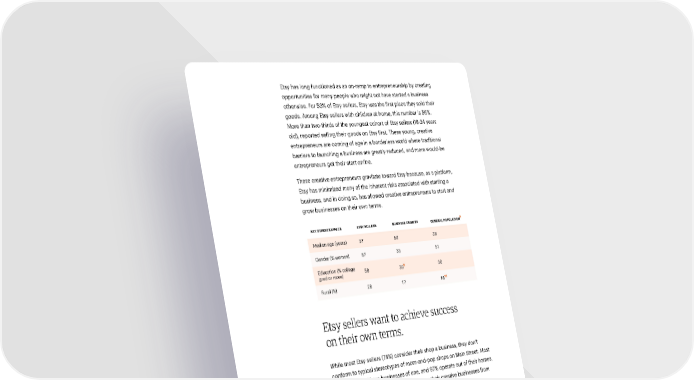 Etsy has long functioned as an on-ramp to entrepreneurship by creating opportunities for many people who might not have started a business otherwise. For 53% of Etsy sellers, Etsy was the first place they sold their goods. Among Etsy sellers with children at home, this number is 56%. More than two-thirds of the youngest cohort of Etsy sellers (18-24 years old), reported selling their goods on Etsy first. These young, creative entrepreneurs are coming of age in a borderless world where traditional barriers to launching a business are greatly reduced, and more would-be entrepreneurs get their start online. These creative entrepreneurs gravitate toward Etsy because, as a platform, Etsy has minimized many of the inherent risks associated with starting a business, and in doing so, has allowed creative entrepreneurs to start and grow businesses on their own terms. KEY DEMOGRAPHICS ETSY SELLERS BUSINESS OWNERS GENERAL POPULATION8 Median age (years) 37 50 38 Gender (% women) 87 33 51 Education (% college 59 9 30 grad or more) 39 Rural (%) 28 17 1810 Etsy sellers want to achieve success on their own terms. While most Etsy sellers (74%) consider their shop a business, they don’t conform to typical stereotypes of mom-and-pop shops on Main Street. Most Etsy sellers (77%) are businesses of one, and 97% operate out of their homes. Two-thirds of these Etsy sellers prefer to run their creative businesses from home, rather than seek a larger production space. Etsy sellers are motivated to start their businesses for both financial 77% and non-financial reasons. For 51% of Etsy sellers, a financial challenge are businesses of one contributed to their decision to start a creative business, but 67% said they were motivated to start their business as a creative outlet. Other motivations included doing something they enjoy with their spare time (65%), and doing work that allows them to have a flexible schedule (43%). These findings conform with broader trends among microbusinesses: the majority of US nonemployer firms cite being their own boss as the main reason for starting their business.11 Etsy sellers also define success differently. The majority (81%) of sellers want 5 2017 Seller Census Report