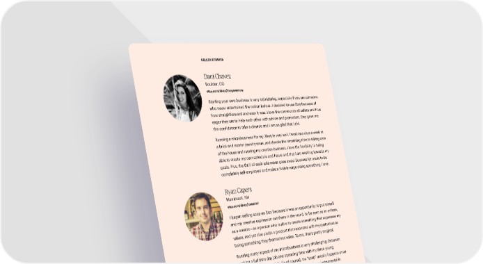 SELLER STORIES Dani Chavez Boulder, CO etsy.com/shop/thegemmary Starting your own business is very intimidating, especially if you are someone who never entertained the notion before. I decided to use Etsy because of how straightforward and easy it was. I love the community of sellers and how eager they are to help each other with advice and promotion. Etsy gave me the confidence to take a chance and I am so glad that I did. Running a microbusiness fits my lifestyle very well. I work two days a week at a brick and mortar jewelry store, and devote the remaining time to taking care of the house and running my creative business. I love the flexibility in being able to create my own schedule and hours and that I am working towards my goals. Plus, the thrill of each sale never goes away! Success for me is to be completely self-employed and make a livable wage doing something I love. Ryan Capers Merrimack, NH etsy.com/shop/lostelixir I began selling soap on Etsy because it was an opportunity to put myself and my creative expression out there in the world, to be seen as an artisan, as a creator — as a person who is able to create something that expresses my values, and yet also yields a product that resonates with my customers as being something they themselves value. To me, that’s pretty magical. Running every aspect of my microbusiness is very challenging. Between working a full time day job and spending time with my three young daughters (and a beautiful wife of course), my “soap” usually happens once everything else completely winds down. Etsy has been instrumental in helping my business grow at a pace I am comfortable with and I can slowly grow my footprint at a pace I can feel in complete ownership over. It sounds crazy, but one of my biggest fears is not being able to keep up with demand and having a “runaway train” scenario, and Etsy makes that all possible. My goal with this business was never to maximize margins, and edge out the competition—instead, I decided I was going to build this business largely to test a theory I had swirling around in my head: If I worked at something consistently with passion, and I focused on quality, customer service, and inspiration, amazing things would happen. So far, I am so happy with the continued progress this business has had in my life professionally and personally. 6 2017 Seller Census Report