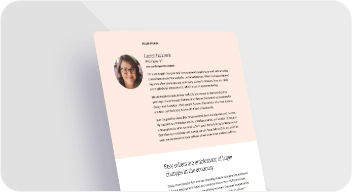 SELLER STORIES Lauren Harkawik Wilmington, VT etsy.com/shop/writtenindetail I’m a self-taught designer and have grown while getting to work with amazing clients from around the world for custom stationery. When my husband joined my shop a few years ago, our work really started to blossom. Now, our cards are in gift shops across the US, which is just an awesome feeling. We left traditional jobs in New York City and moved to Vermont about six years ago. It was through that transition that we discovered our passions for design and illustration. Most people discover their artistic side, have success, and then quit their jobs, but we did it kind of backwards. Over the past five years, Etsy has sometimes been our sole source of income. My husband is a filmmaker and I’m a freelance writer, and we pick up projects in those pursuits when we need to fill in gaps. We’re lucky to be freelancers in that when our microbusiness is busy, we can focus fully on that, and when it’s slow, we can transition back to those others sides of our professional lives. Etsy sellers are emblematic of larger changes in the economy. Today, more people than ever are choosing to work outside of the traditional full-time employment model and combine income from multiple sources. To be sure, there are some in the shifting economy that work independently out of necessity, yet the majority (72%) work independently by choice.16 A recent study by McKinsey showed that 27% of the U.S. workforce today consists of independent workers, combining income from multiple sources. 53% The study further showed that one in six workers in traditional full-time are part of the independent employment would like to become primary independent earners. workforce In some ways, Etsy sellers are emblematic of these larger economic shifts. The majority (53%) are part of the independent workforce either through their creative business, other self-employment, or part-time or temporary work. Only 32% of Etsy sellers have traditional full-time jobs. Across the U.S., 11% of Etsy sellers are retirees, full-time caregivers, and students, all of whom benefit from the flexibility the nature of creative entrepreneurship offers. 9 2017 Seller Census Report