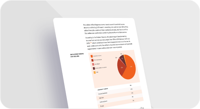 Etsy sellers reflect larger economic trends toward diversified income streams and finding fulfillment in rewarding side work. In total, 52% of Etsy sellers have jobs outside of their creative businesses, and four out of five Etsy sellers are comfortable combining income from multiple sources. According to the Federal Reserve, the percentage of people earning income from multiple sources jumped from 15% to 22% between 2014 and 2015,17 18 which we believe shows that independent work is on the rise. As work continues to shift, the ability to diversify income streams and generate supplemental income will become even more important. EMPLOYMENT AMONG ETSY SELLERS Independent workers 2% Full-time employees 2% 11% Unemployed Retired, student, or caregiver 32% 53% Other INDEPENDENT WORKERS 53% Creative business 32% Part-time 10% Self-employed 9% Temps 2% Etsy sellers’ experiences shed light on the challenges of the new economy. As microbusinesses, Etsy sellers face unique challenges that, while common among independent workers and the self-employed, often differ from even a ten- or twenty-person small business. Income volatility While unpredictable income is widespread and affects more than just independent workers, Etsy sellers cite income volatility—predicting future 10 2017 Seller Census Report