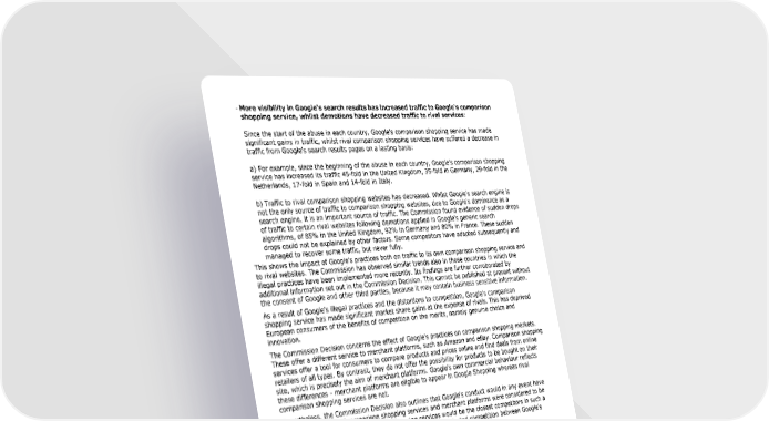 - More visibility in Google's search results has increased traffic to Google's comparison shopping service, whilst demotions have decreased traffic to rival services: Since the start of the abuse in each country, Google's comparison shopping service has made significant gains in traffic, whilst rival comparison shopping services have suffered a decrease in traffic from Google's search results pages on a lasting basis: a) For example, since the beginning of the abuse in each country, Google's comparison shopping service has increased its traffic 45-fold in the United Kingdom, 35-fold in Germany, 29-fold in the Netherlands, 17-fold in Spain and 14-fold in Italy. b) Traffic to rival comparison shopping websites has decreased. Whilst Google's search engine is not the only source of traffic to comparison shopping websites, due to Google's dominance as a search engine, it is an important source of traffic. The Commission found evidence of sudden drops of traffic to certain rival websites following demotions applied in Google's generic search algorithms, of 85% in the United Kingdom, 92% in Germany and 80% in France. These sudden drops could not be explained by other factors. Some competitors have adapted subsequently and managed to recover some traffic, but never fully. This shows the impact of Google's practices both on traffic to its own comparison shopping service and to rival websites. The Commission has observed similar trends also in those countries in which the illegal practices have been implemented more recently. Its findings are further corroborated by additional information set out in the Commission Decision. This cannot be published at present without the consent of Google and other third parties, because it may contain business sensitive information. As a result of Google's illegal practices and the distortions to competition, Google's comparison shopping service has made significant market share gains at the expense of rivals. This has deprived European consumers of the benefits of competition on the merits, namely genuine choice and innovation. The Commission Decision concerns the effect of Google's practices on comparison shopping markets. These offer a different service to merchant platforms, such as Amazon and eBay. Comparison shopping services offer a tool for consumers to compare products and prices online and find deals from online retailers of all types. By contrast, they do not offer the possibility for products to be bought on their site, which is precisely the aim of merchant platforms. Google's own commercial behaviour reflects these differences - merchant platforms are eligible to appear in Google Shopping whereas rival comparison shopping services are not. Nevertheless, the Commission Decision also outlines that Google's conduct would in any event have been abusive, even if comparison shopping services and merchant platforms were considered to be part of the same market: comparison shopping services would be the closest competitors in such a broader market and Google's practices have significantly distorted competition between Google's product and comparison shopping services. Fine The Commission's fine of €2 424 495 000 takes account of the duration and gravity of the infringement. In accordance with the Commission's 2006 Guidelines on fines (see press release and MEMO), the fine has been calculated on the basis of the value of Google's revenue from its comparison shopping service in the 13 EEA countries concerned. Under the Decision, Google must stop its illegal practices concerning its own comparison shopping service within 90 days, and refrain from any measure that has the same or an equivalent object or effect. In particular, Google has to respect the simple principle of equal treatment in its search results for its own comparison shopping product and rival comparison shopping products. Google has to apply the same processes and methods to position and display rival comparison shopping services in Google's search results pages as it gives to its own comparison shopping service. It is Google's sole responsibility to ensure compliance and it is for Google to explain how it intends to do so. Regardless of which option Google chooses, the Commission will monitor Google's compliance closely and Google is under an obligation to keep the Commission informed of its actions (initially within 60 days of the Decision, followed by periodic reports). Non-compliance would be the subject of a separate case where Google would have the opportunity to comment. If the Commission were to decide that Google had failed to comply with its obligations under the decision, it would be subject to a daily penalty payment of up to 5% of the average daily worldwide turnover of Alphabet, Google's parent, with any payment backdated to when the non-compliance started.