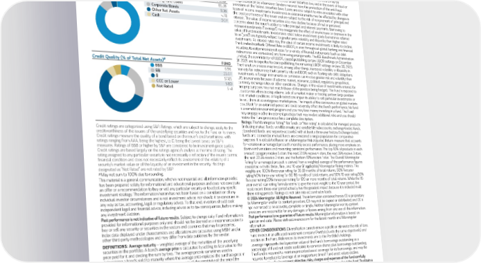 # the effect of any applicable sales charges, commissions, expenses, taxes or leverage, as Top 10 Sectors (% of Total Net Assets) FUND applicable. e. It is not possible to invest directly in an index. Historical performance of the Software 13.08 index illustrates market trends and does not represent the past or future performance of the Hotels Restaurants & Leisure 5.79 fund. Machinery 5.23 RISK CONSIDERATIONS: The value of investments held by the Fund may increase or decrease Health Care Providers & Services 4.97 in response to economic, and financial events (whether real, expected or perceived) in the U.S. and global markets. Loans are traded in a private, unregulated inter-dealer or inter-bank resale Chemicals 4.79 market and are generally subject to contractual restrictions that must be satisfied before a Capital Markets 4.71 loan can be bought or sold. These restrictions may impede the Fund’s ability to buy or sell IT Services 3.58 loans (thus affecting their liquidity) and may negatively impact the transaction price. It may take longer than seven days for transactions in loans to settle. Due to the possibility of an Professional Services 3.25 extended loan settlement process, the Fund may hold cash, sell investments or temporarily Trading Companies & Distributors 2.99 borrow from banks or other lenders to meet shortterm liquidity needs. Loans may be Insurance 2.70 structured such that they are not securities under securities law, and in the event of fraud or misrepresentation by a borrower, lenders may not have the protection of the anti-fraud # Asset Mix (% of Total Net Assets) FUND provisions of the federal securities laws. Loans are also subject to risks associated with other Floating-Rate Loans 85.59 types of income investments. Investments in debt instruments may be affected by changes in Corporate Bonds 9.36 the creditworthiness of the issuer and are subject to the risk of nonpayment of principal and Other Net Assets 4.78 interest. The value of income securities also may decline because of real or perceived concerns about the issuer’s ability to make principal and interest payments. Borrowing to Cash 0.27 increase investments (“leverage”) may exaggerate the effect of any increase or decrease in the value of Fund investments. Investments rated below investment grade (sometimes referred to as “junk”) are typically subject to greater price volatility and illiquidity than higher rated investments. As interest rates rise, the value of certain income investments is likely to decline. The London Interbank Offered Rate or LIBOR, is used throughout global banking and financial industries to determine interest rates for a variety of financial instruments (such as debt instruments and derivatives) and borrowing arrangements. The ICE Benchmark Administration Limited, the administrator of LIBOR, ceased publishing certain LIBOR settings on December 31, 2021, and is expected to cease publishing the remaining LIBOR settings on June 30, 2023. # Credit Quality (% of Total Net Assets) FUND The transition process may involve, among other things, increased volatility or illiquidity in markets for instruments that currently rely on LIBOR, such as floating-rate debt obligations. BBB 6.96 Investments in foreign instruments or currencies can involve greater risk and volatility than BB 23.97 U.S. investments because of adverse market, economic, political, regulatory, geopolitical, B 57.85 currency exchange rates or other conditions. Changes in the value of investments entered for CCC or Lower 5.80 hedging purposes may not match those of the position being hedged. The Fund is exposed to Not Rated 5.41 liquidity risk when trading volume, lack of a market maker or trading partner, large position size, market conditions, or legal restrictions impair its ability to sell particular investments or to sell them at advantageous market prices. The impact of the coronavirus on global markets could last for an extended period and could adversely affect the Fund’s performance. No fund is a complete investment program and you may lose money investing in a fund. The Fund may engage in other investment practices that may involve additional risks and you should review the Fund prospectus for a complete description. Ratings: The Morningstar Rating™ for funds, or "star rating", is calculated for managed products (including mutual funds, variable annuity and variable life subaccounts, exchange-traded funds, Credit ratings are categorized using S&P. Ratings, which are subject to change, apply to the closed-end funds, and separate accounts) with at least a three-year history. Exchange-traded creditworthiness of the issuers of the underlying securities and not to the Fund or its shares. funds and openended mutual funds are considered a single population for comparative Credit ratings measure the quality of a bond based on the issuer’s creditworthiness, with purposes. It is calculated based on a Morningstar Risk-Adjusted Return measure that accounts ratings ranging from AAA, being the highest, to D, being the lowest based on S&P’s for variation in a managed product's monthly excess performance, placing more emphasis on measures. Ratings of BBB or higher by S&P are considered to be investment-grade quality. downward variations and rewarding consistent performance. The top 10% of products in each Credit ratings are based largely on the ratings agency’s analysis at the time of rating. The product category receive 5 stars, the next 22.5% receive 4 stars, the next 35% receive 3 stars, rating assigned to any particular security is not necessarily a reflection of the issuer’s current the next 22.5% receive 2 stars, and the bottom 10% receive 1 star. The Overall Morningstar financial condition and does not necessarily reflect its assessment of the volatility of a Rating for a managed product is derived from a weighted average of the performance figures security’s market value or of the liquidity of an inves