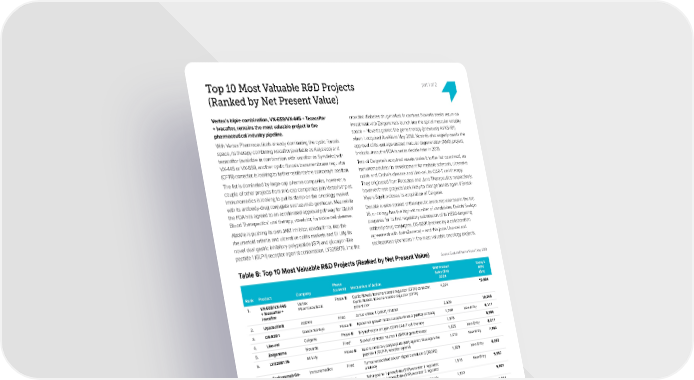 Top 10 Most Valuable R&D Projects part 1 of 2 (Ranked by Net Present Value) Vertex’s triple combination, VX-659/VX-445 + Tezacaftor crowded diabetes drug market. In contrast, Novartis seeks return on + Ivacaftor, remains the most valuable project in the investment with Zolgensma’s launch into the spinal muscular atrophy pharmaceutical industry pipeline. space – Novartis gained the gene therapy (previously AVXS-101) With Vertex Pharmaceuticals already dominating the cystic 昀椀brosis when it acquired AveXis in May 2018. Novartis also eagerly awaits the space, its therapy combining ivacaftor (available as Kalydeco) and approval of its wet age-related macular degeneration (AMD) project, tezacaftor (available in combination with ivacaftor as Symdeko) with brolucizumab; the FDA is set to decide later in 2019. VX-445 or VX-659, another cystic 昀椀brosis transmembrane regulator Two of Celgene’s acquired assets make it to the list: ozanimod, an (CFTR) corrector, is looking to further reinforce the company’s position. immunomodulator in development for multiple sclerosis, ulcerative The list is dominated by large-cap pharma companies, however, a colitis and Crohn’s disease and Liso-cel, its CAR-T cell therapy. couple of other projects from mid-cap companies join Vertex’s triplet. They originated from Receptos and Juno Therapeutics respectively, Immunomedics is looking to put its stamp on the oncology market however these projects look likely to change hands again if Bristol- with its antibody-drug conjugate sacituzumab govitecan. Meanwhile Myers Squibb closes its acquisition of Celgene. the FDA has agreed to an accelerated approval pathway for Global Despite a wide spread of therapeutic areas represented in the top Blood Therapeutics’ oral therapy, voxelotor, for sickle cell disease. 10, oncology has the highest number of candidates. Daiichi Sankyo AbbVie is pushing its own JAK1 inhibitor, upadacitinib, into the prepares for its 昀椀rst regulatory submission of its HER2-targeting rheumatoid arthritis and ulcerative colitis markets and Eli Lilly, its antibody drug conjugate, DS-8201 (backed by a collaboration novel dual gastric inhibitory polypeptide (GIP) and glucagon-like agreement with AstraZeneca) – and this joins Liso-cel and peptide 1 (GLP-1) receptor agonist combination, LY3298176, into the sacituzumab govitecan in the most valuable oncology projects. ® Table 8: Top 10 Most Valuable R&D Projects (Ranked by Net Present Value) Source: EvaluatePharma Vision, May 2019 WW Product Today’s Phase Sales ($m) NPV Rank Product Company (current) Mechanism of Action 2024 ($m) 1. VX-659/VX-445 Vertex Phase III Cystic 昀椀brosis transmembrane regulator (CFTR) corrector; 4,274 19,984 + Tezacaftor + Pharmaceuticals Cystic 昀椀brosis transmembrane regulator (CFTR) Ivacaftor potentiator 2. Upadacitinib AbbVie Filed Janus kinase 1 (JAK1) inhibitor 2,509 10,246 3. DS-8201 Daiichi Sankyo Phase III Epidermal growth factor receptor ErbB-2 (HER2) antibody 1,790 New Entry 9,111 4. Liso-cel Celgene Phase III B-lymphocyte antigen CD19 CAR-T cell therapy 1,378 8,986 5. Zolgensma Novartis Filed* Survival of motor neuron 1 (SMN1) gene therapy 1,635 New Entry 8,011 6. LY3298176 Eli Lilly Phase III Gastric inhibitory polypeptide (GIP) agonist; Glucagon-like 1,012 New Entry 7,460 peptide 1 (GLP-1) receptor agonist 7. Sacituzumab Go- Immunomedics Filed Tumour-associated calcium signal transducer 2 (TROP2) 1,589 New Entry 6,092 vitecan antibody 8. Ozanimod Celgene Filed Sphingosine 1-phosphate (S1P) receptor 1 regulator; 1,516 New Entry 5,957 Sphingosine 1-phosphate (S1P) receptor 5 regulator 9. Brolucizumab Novartis Filed Vascular endothelial growth factor (VEGF) antibody 1,322 5,907 fragment (Fab) 10. Voxelotor Global Blood Phase III Sickle haemoglobin (HbS) polymerisation inhibitor 1,711 New Entry 5,871 Therapeutics Top 10 18,737 87,625 Other 175,045 503,317 Total 193,782 590,943 NPV of R&D Pipeline MAY 2018: 576,990 Note: Today’s NPV ($m) relates to the Net Present Value of the product as of the May 10th, 2019, based on the EvaluatePharma Vision® NPV Analyzer. VX-659/VX-445 + Tezacaftor + Ivacaftor; Includes sales forecasts for Vertex triples, VX-445 + Tezacaftor + Ivacaftor or VX-659 + Tezacaftor + Ivacaftor. * Zolgensma was approved by the US FDA on May 24th, 2019. ® 16 EvaluatePharma World Preview 2019 Copyright © 2019 Evaluate Ltd. All rights reserved.