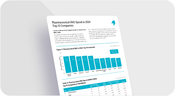 Pharmaceutical R&D Spend in 2024: Top 10 Companies Johnson & Johnson leads as biggest spender on pharmaceutical sales in 2024 with 23.6%. GlaxoSmithKline is forecast to have the R&D in 2024. highest growth in pharma R&D spend of the top 10. With a decrease ® in pharma R&D expenditure vs. total Rx sales of 7.3%, AstraZeneca EvaluatePharma 昀椀nds that J&J just edges Roche to claim the position as the forecasted top spender on R&D in 2024, with is forecasted to have the greatest return on R&D investment in a spend of $9.9bn. Novartis drops to fourth place, with Merck 2024. Overall, total R&D spend is expected to increase by 3.0% forecasted to claim third position by a 昀椀ne margin. Of the top 10, each year, reaching $213.0bn in 2024. Eli Lilly is forecast to invest the highest percentage of prescription Figure 7: Pharmaceutical R&D in 2024: Top 10 Companies Source: EvaluatePharma, May 2019 12.0 R&D Spend ($bn) 10.0 CAGR 2018-24 (%) 8.0 9.9 9.9 +2.6% +0.1% 9.2 9.2 8.9 +2.5% +2.0% +1.9% 6.0 6.8 6.7 6.7 +5.3% +4.5% +1.2% 6.1 5.9 4.0 +3.4% +1.8% Pharma R&D Spend ($bn)2.0 0.0 Johnson & Roche Merck & Co Novartis Pfizer GlaxoSmithKline Bristol-Myers Sanofi Eli Lilly AstraZeneca Johnson Squibb Table 11: Pharmaceutical R&D Spend (2018 & 2024): Top 10 Companies & Total Market Source: EvaluatePharma, May 2019 Pharma R&D ($bn) CAGR R&D As a % of Prescription Sales Rank Company 2018 2024 2018-24 2018 2024 Chg. (+/-) 1. Johnson & Johnson 8.4 9.9 +2.6% 21.8% 21.6% -0.2pp 2. Roche 9.8 9.9 +0.1% 22.0% 21.1% -0.9pp 3. Merck & Co 7.9 9.2 +2.5% 21.2% 21.6% +0.4pp 4. Novartis 8.2 9.2 +2.0% 18.8% 18.4% -0.4pp 5. P昀椀zer 8.0 8.9 +1.9% 17.6% 17.4% -0.2pp 6. GlaxoSmithKline 5.0 6.8 +5.3% 16.3% 17.6% +1.3pp 7. Bristol-Myers Squibb 5.1 6.7 +4.5% 23.8% 22.5% -1.3pp 8. Sano昀椀 6.2 6.7 +1.2% 17.7% 16.4% -1.3pp 9. Eli Lilly 5.0 6.1 +3.4% 25.5% 23.6% -1.9pp 10. AstraZeneca 5.3 5.9 +1.8% 25.5% 18.2% -7.3pp Total Top 10 68.9 79.1 +2.3% 20.4% 19.6% -0.8pp Other 110.0 133.9 +3.3% Total 178.9 213.0 +3.0% 21.6% 18.0% -3.6pp Note: Forecasted pharmaceutical R&D spend based on a consensus of leading equity analysts’ estimates for company-level R&D spend. ® 19 EvaluatePharma World Preview 2019 Copyright © 2019 Evaluate Ltd. All rights reserved.
