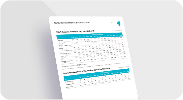 Worldwide Prescription Drug Sales (2010-2024) part 2 of 2 Table 1: Worldwide Prescription Drug Sales (2010-2014) Source: EvaluatePharma, May 2019 WW Prescription Sales ($bn) Year 2010 2011 2012 2013 2014 2015 2016 2017 2018 2019 2020 2021 2022 2023 2024 Prescription 689 734 721 730 755 747 772 789 828 844 893 955 1,027 1,100 1,181 Growth per Year +6.6% -1.7% +1.3% +3.4% -1.0% +3.3% +2.2% +5.0% +2.0% +5.7% +7.0% +7.5% +7.1% +7.4% Change vs. June 2018 ($bn) -2 -28 -34 -43 -43 -34 -23 Generics 60 66 66 69 75 77 80 78 75 79 84 88 92 96 100 Generics as % of Prescription 8.7% 9.0% 9.2% 9.5% 9.9% 10.3% 10.3% 9.9% 9.1% 9.4% 9.4% 9.2% 9.0% 8.7% 8.4% Prescription excl. Generics 629 668 655 661 680 670 692 710 753 765 809 867 935 1,004 1,081 Growth per Year +6.3% -2.0% +0.9% +2.9% -1.4% +3.3% +2.6% +6.0% +1.6% +5.8% +7.1% +7.8% +7.4% +7.7% Orphan 72 80 84 91 96 100 109 118 130 135 150 169 191 216 239 Prescription excl. Generics 557 589 571 570 584 570 584 593 622 629 659 698 743 788 842 & Orphan Prescription incl. Generics CAGR 2019-24 +6.9% Note: Sales to 2018 based on company reported sales data. Sales forecasts to 2024 based on a consensus of leading equity analysts’ estimates for company product sales and segmental sales. Table 2: Worldwide Sales At Risk from Patent Expiration (2010-2024) Source: EvaluatePharma, May 2019 WW Prescription Sales ($bn) Year 2010 2011 2012 2013 2014 2015 2016 2017 2018 2019 2020 2021 2022 2023 2024 Total Sales at Risk 29 34 52 33 31 52 39 33 39 39 14 16 40 57 32 Expected Sales Lost 12 20 36 23 20 18 18 30 23 20 19 14 16 23 22 % Market at risk 4.2% 4.6% 7.2% 4.5% 4.1% 6.9% 5.1% 4.2% 4.7% 4.7% 1.6% 1.6% 3.9% 5.2% 2.7% 9 ® World Preview 2019 Copyright © 2019 Evaluate Ltd. All rights reserved. EvaluatePharma