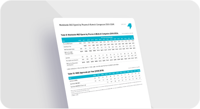 Worldwide R&D Spend by Pharma & Biotech Companies (2010-2024) part 2 of 2 Table 9: Worldwide R&D Spend by Pharma & Biotech Companies (2010-2024) Source: EvaluatePharma, May 2019 WW Prescription Sales ($bn) Year 2010 2011 2012 2013 2014 2015 2016 2017 2018 2019 2020 2021 2022 2023 2024 Pharma R&D Spend 128.6 136.5 136.0 138.4 144.6 149.9 159.8 168.0 178.9 181.7 189.0 195.5 201.8 207.4 213.0 Growth per Year +6.2% -0.4% +1.8% +4.4% +3.7% +6.7% +5.1% +6.5% +1.6% +4.0% +3.5% +3.2% +2.8% +2.7% WW Prescription Sales 689 734 721 730 755 747 772 789 828 844 893 955 1,027 1,100 1,181 R&D as % of WW 18.7% 18.6% 18.9% 18.9% 19.1% 20.1% 20.7% 21.3% 21.6% 21.5% 21.2% 20.5% 19.7% 18.9% 18.0% Prescription Sales Generics 60 66 66 69 75 77 80 78 75 79 84 88 92 96 100 Prescription excl. Generics 629 668 655 661 680 670 692 710 753 765 809 867 935 1,004 1,081 R&D as % of Prescription 20.5% 20.4% 20.8% 20.9% 21.3% 22.4% 23.1% 23.7% 23.8% 23.8% 23.4% 22.6% 21.6% 20.7% 19.7% excl. Generics CAGR 2018-24 on Pharma R&D Spend +3.0%. Cumulative 10 year R&D Spend (2009-18) $1,468bn. Table 10: NME Approvals per Year (2006-2018) Source: EvaluatePharma, May 2019 Year 2006 2007 2008 2009 2010 2011 2012 2013 2014 2015 2016 2017 2018 Number of NMEs 29 25 31 35 26 35 44 35 51 56 27 55 62 Spend per NME ($bn) 3.8 4.9 4.2 3.6 4.9 3.9 3.1 4.0 2.8 2.7 5.9 3.1 2.9 Spend per NME ($bn) (3 year lag)* 3.2 4.7 3.8 2.9 3.7 2.7 2.4 5.1 2.6 2.4 Note: Forecast pharmaceutical research and development spend based on a consensus of leading equity analysts’ estimates for company level R&D spend, extrapolated to pharmaceutical R&D when a company has non-pharmaceutical R&D activity. *Spend per NME ($bn) (3 year lag) uses the R&D expense for 3 years prior to the NME approval instead of the same year. e.g. the 2018 昀椀gure of $2.4bn is the R&D expense in 2015 divided by the number of NMEs in 2018. ® 18 EvaluatePharma World Preview 2019 Copyright © 2019 Evaluate Ltd. All rights reserved.