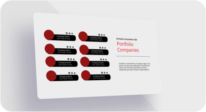 Company Name Company Name FinTech Innovation lab their field of work their field of work Portfolio Companies Company Name Company Name their field of work their field of work Company Name Company Name Curabitur ut euismod leo, id congue augue. Cras their field of work their field of work auctor, leo vel iaculis sollicitudin, dui est lacinia turpis, sed euismod turpis libero eu lectus. Maecenas quis tellus id libero feugiat dapibus. Company Name Company Name their field of work their field of work