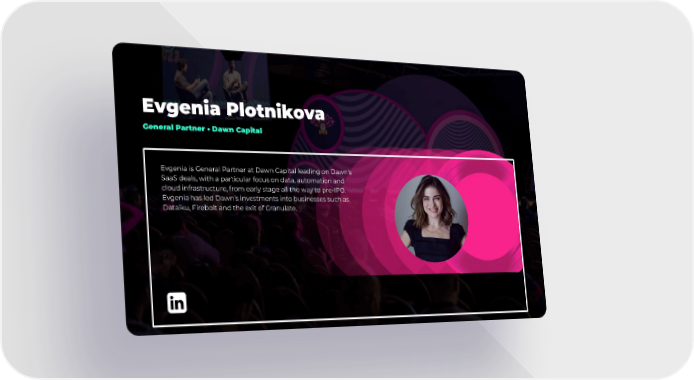 Evgenia Plotnikova General Partner • Dawn Capital Evgenia is General Partner at Dawn Capital leading on Dawn’s SaaS deals, with a particular focus on data, automation and cloud infrastructure, from early stage all the way to pre-IPO. Evgenia has led Dawn’s investments into businesses such as Dataiku, Firebolt and the exit of Granulate.