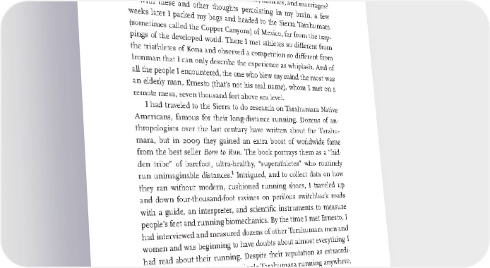 6 6 exerecxIersedcIsed Are WAe Bre Wore Bn too Rrn teso Rt oer Rst ounr R? un? 7 7 wealwthey alTthypy e TyA ppe ersA poersnaloitnies alitwies ho wahpo play ptphle y stahme se afmane aftaicnaal tidceavl odteiovn ottio on to thirtty hiyretay rs yeyaors unygoerun, gEerrn, estErno estwao s winais tiianlliy tiarellty icrenetit caens t I ams eI amsueraesud hreis d his exerecxisere ctishee y thperey vpioreuvsiloy udsely didceadteid catto ed thteio r thceiarr ecers. areers. MucMh uacs h I aas dmI aidre mire heighheit, gwheit, gwheit, glehg t, lleneg gltenh, gatnhd , afened t, feaentd , athnen d thuen sed ua sehd iga h-h sigph-eed sp eedvideo vi deo theste htesrie atthrlieatteshl, etaesre , tahree y thdeay mdaagminag gtinheig r thbeior dibesod? iFeso? r Fevoerr ey vIerroy nImroann man camcerama tero a retco orred choris d rhuis nnruinng nbiniog mbeiocmhaencihcas noin cs a osn ma asll mtraalcl k trI achk ad I hseat d set who whuo alifiuesali, fihesow , hmow anmy awnoy uwldo bue ldI broe nImroen nmwen ere wseride esliindeed linbey d cbriy pcrip up. uTph. aTnkhfaunlkly fufollr y mfoer , mhe e, ghre adguraaldly uablely cabmece amince reinacsrineagsly ingagly rrgaulorruus lous plinpg liinng uirniesu? riesh? at hiant d oinf d tooll f dtooles l daoles l thale l ttrhae intrinaig nnineg cesnescaesry stao ry do to do and astnad rtsted artto ed tetlo l stteoll ristes or(ites hro(tuhgrh ouagn h inan terinptrereterpr) etaerbo) uat btohue t othld e doald ys days a fula l fturilal tthrlioan thhloan ve hoan ve thon e aththe leatteshl’ eftesrien’ frdisen, fdasm, filaimesi, laiesnd , amnad rmriaagresria?ges? when whhen e hhue nhteud ndteed er doen er fooon t fboy ot ruby nnruinng ntinhem g thdem owdn oawnn d asnod mseotimmees times ith tihth este hesane d aontd her othther outghhotus ghpters cpoerlatcionlg atiinn g min y mbry ainbr, aa inf, ew a few dancdead ncfoer d dfoar ys dian ys cerin emceroemnies. oniEes. rnestErno esttolo d tmold e hme e whae s wa acs ha amchpaiomn pion weews eelats er laI ter paI cpaed cmed y bamy gs baags nd ahned adheed adto ed thto e thiere ra ierTraa raThaurmahaurma ara runnruer ninn er hiis n yhois utyh ouanth d atnhd at thhe at sthie ll stcoilml cpoemtepd eitn ed sein verseavl erraacl es raa ces yeaa ry. ear. €som€seotimmees timcaes llecd altlhed e ‚thoe p‚per op‚per an‚yoannsyƒ oonf sMƒ oef xMicoe, xifcaor , ffraor m frtohm e ttrhae ptrap ut wuht en whI en askI ead skheim d hhiom w hhoe w trhae intreadi, nhee d, dhide nd’t idunn’t duerstndaerstnd athne d thue es-ues- pings pinogs f thoe f dthee vedloepveeld opweod rlwd. orTldh. erTe hI erme eI t mateht leattes hlesto es dsiffo erdienffert fenrot m fr om tion. tionh. en hI en desI cdresibecd ribheod w how mermicaernis calinks e lmike e kmee ep kefiet p anfid t apnrd epaprree pare the ttrhie atthrlieattes hleotf es …oof n…a oanna d aonbd serobvseerd va ecd oma cpoemtitpioen titsioo n dsiffo erdienffert fenrot m from for rfaocr es rabcy es rubny nruinng nsinevg erseavl ertimal es tima es wea ekw, ehee k, seheme seeemd inecd reindcurleoduus. lous s. s IronImroann mthan at tI hcaat n I coann ly odnesly cdresibe crtihbe e ethxe perexipenercie enas ce wahs ipwlahsihpl. aAshn. d Aonf d of I askI ead skmeod rme oure estuioestnsi, ohne s, mhae dme iat dpe reit tpty rectltey ar clhee ar thhoe utghhot utghhe t ctohne cceopnt cept all thae ll pthee opplee oI penle cI oenunctoerunedter, tehde , othne e ownhe o wbhleo w bmlew y mmiy nmd tihne d mthoe st mwoast s was of neoef dnleeseds lresus nnruinng nwinag s wpares pporsteperoostuers. o us. h y, hhye , ahske ead skmee d wmie th weivth i- evi- an ealdn erelly dermlay nm, †anrn, est†rno est€tho at€’ts hanto’s t hnis ot rheis al rneaaml neaƒ, mwehƒ, owm hI om meI t mon et a on a dent ddenist dbeisliefbe, liefwo, uwld aounld ayonne ryonue rn wuhn wen thhen tey dheidy dn’t hidna’vt he taov€e t o€ remroemte motese ma, seseav, sen tevhen toushaonud fsaened ft aebeot ave sboeva le seeva lel.evel. ‚ince ‚ince I had I had ƒust ƒust witnessed witnessed the the intensity intensity of Ironman of Ironman triathletes, triathletes, I haI d htraad vetrlead vetlo ed thto e thiere ra ierto ra do to rdeso eraesrceh arocn h Toan raThaurmahaurma ‡araa ti‡ve a tive whose whose arduous arduous training training habits habits are legendaryare legendary, I found , I found that that ErnestoErnesto’s ’s AmerAmicaernisc, afnasm, ofaums ofuor s tfhoeir r thleionr glo dnistga dnistce anruce nnruinngn. inˆgo. ‰ˆenos ‰enof s anof an uestion uestion made made me both me both laugh laugh and and think. think. „e put „e put the e…ercise the e…ercise habits habits throtphorloopgoistlos gistovs er ovther e tlhast e lcaenst tcuenry tuhray ve hawvre itwten rittaen bouat bothue t tThae raThaurahu of many of many esterners, esterners, myself myself included, included, into into stark stark perspective. perspective. If you If you marma, abura, t buin t Ši‹n ‹ŠŒ ‹t‹hŒ ey thgaey ingaed inaen d eaxn tra exbtroa ost booof st woof rlwdworildde wifdame e fame were were a subsistence a subsistence farmer farmer like like Ernesto Ernesto who who grows grows all his all own his own food food from frothm e bthest e bsest eller selBorn ler Born to Runto Run. Th. e Tbhoe o bopoo rtpraoyrs trtahyem s thaem s a a“s ha id“hid without without the the help help of machines, of machines, why why would would you you ever ever spend spend precious precious den dten ribet” riboef ” baof refbaooreft, ouoltt, raul hteraal htheya, lt“hsuy, p“ersuaptherleatteshl” eteswh” o wrhoo utrinouelty inely time time and and calories calories e…ercising e…ercising ƒust ƒust for the for sake the sake of keeping of keeping fit or fit to or prove to prove 1 1 run ruunn imunagiminaagbilne adbistle adnistces.ances. that that anything anything is possible€ is possible€ Ernesto Ernesto reinforced reinforced my conviction my conviction that that what what Intr iIgnutrei