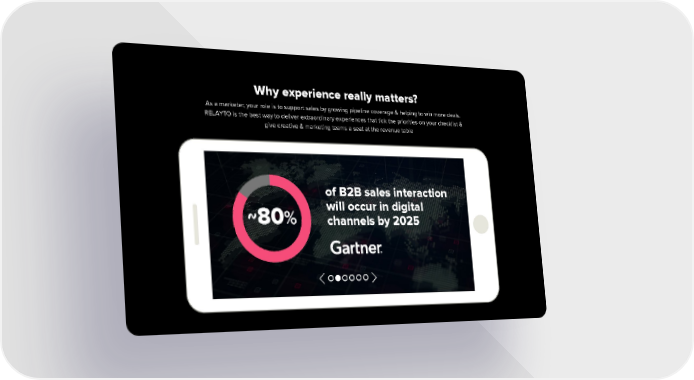 Why experience really matters? As a marketer, your role is to support sales by growing pipeline coverage & helping to win more deals. RELAYTO is the best way to deliver extraordinary experiences that tick the priorities on your checklist & give creative & marketing teams a seat at the revenue table of B2B sales interaction will occur in digital 80% channels by 2025 ~