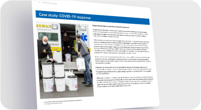 Case study: COVID-19 response ExxonMobil donated hand sanitizer and personal protective equipment to first responders around the world. 36 | Sustainability Report Highlights Supporting emergency responders and medical personnel By mid-April 2020, the need for medical masks, hospital gowns and other medical equipment and packaging had increased significantly. We answered this demand by increasing our manufacturing capability of specialized polypropylene at facilities in Louisiana, Texas and Singapore to enable production of hundreds of millions of masks and tens of millions of gowns each month. At the same time, we boosted production and supply of isopropyl alcohol – a key ingredient in many disinfectant products – to enable production of millions of bottles of hand sanitizer. We provided thousands of gallons of isopropyl alcohol to make urgently needed disinfectant for the U.S. Transportation Security Administration to protect its officers and passengers in airports across the United States. We also answered a request from New York state officials who needed large quantities of isopropyl alcohol to make hand sanitizer for emergency responders, primary care health professionals, senior health centers and others. We made similar donations of isopropyl alcohol and specialty polypropylene and polyethylene in other countries. We did our best to meet growing demand from the private sector as well. For example, we provided isopropyl alcohol to E.T. Browne, a small, family-owned business best known for its Palmer’s® personal care products, when it decided to repurpose its Pennsylvania factory to make medical-grade hand sanitizer for the U.S. military and medical first responders. In late April, we went beyond production by temporarily reconfiguring manufacturing operations at our Louisiana facilities to enable us to produce, blend, package and distribute hand sanitizer. The Federal Emergency Management Agency distributed these supplies amongst organizations supporting COVID-19 first responders across the United States. Additionally, we deployed our technical and logistical expertise to help solve problems associated with shortages of personal protective equipment, which typically can only be used for short periods before having to be replaced. We collaborated with the Association of the Nonwoven Fabrics Industry and contributed technical and product application expertise to help support the development of masks and face shields to protect first responders, medical caregivers and the general public in their return to work.