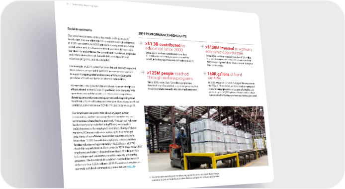 We temporarily reconfigured manufacturing operations at our facilities in Baton Rouge, Louisiana, to give us the ability to produce, blend, package and distribute hand sanitizer. Social investments Our social investments address key needs, such as access to health care, disaster relief, education and economic development. In 2019, we contributed $253 million to communities around the world, which includes donations from Exxon Mobil Corporation, our divisions and affiliates, the ExxonMobil Foundation, employee and retiree giving through ExxonMobil’s matching gift and volunteer programs, and disaster relief. For example, in 2019, when Cyclones Idai and Kenneth impacted Mozambique, we provided $400,000 in emergency assistance to support ongoing relief and recovery efforts, including the provision of food and shelter in affected communities. We are also actively involved in worldwide support of response efforts related to the COVID-19 pandemic. As a company with operations around the world, our efforts have ranged from donating personal protective equipment and supporting local food banks, to reconfiguring our own operations to produce hand sanitizer. Learn more in our COVID-19 case study on page 34. Our employees are passionate about engaging in their communities, and we encourage them to contribute to the communities where they live and work. Through our volunteer involvement program in the United States, we provide a $500 donation to the employee’s or retiree’s charity of choice for every 20 hours a volunteer works, up to four times per year. Many of our affiliates have similar volunteer programs. More than 17,000 ExxonMobil employees, retirees and their families volunteered approximately 443,000 hours at 3,700 charitable organizations in 28 countries in 2019. More than 4,100 employees and retirees donated more than $18 million to 825 U.S. colleges and universities, as well as minority scholarship programs. The ExxonMobil Foundation matched that amount with more than $33.6 million in 2019. For more information on our work with local communities, please visit our website . 26 | Sustainability Report Highlights >$1.3B contributed to education since 2000 Since 2000, we have contributed more than $1.3 billion to education programs around the world, including approximately $59 million in 2019. >125M people reached through malaria programs Since 2000, more than 125 million people have benefited from ExxonMobil-supported programs that focus on malaria research, education and treatment. >$120M invested in women’s economic opportunities Since 2005, we have invested more than $120 million to support women in more than 90 countries to fulfill their economic potential and drive economic change in their communities. 160K gallons of hand sanitizer In 2020, as part of our work to support the response to the COVID-19 pandemic, we temporarily reconfigured manufacturing operations in Louisiana to enable us to produce up to 160,000 gallons of hand sanitizer, which was donated to frontline workers and military personnel. 2019 PERFORMANCE HIGHLIGHTS