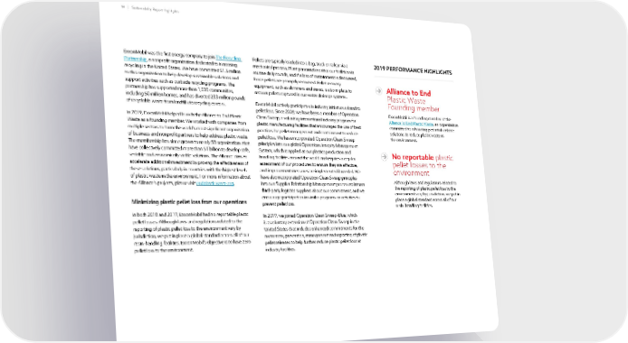14 | Sustainability Report Highlights ExxonMobil was the first energy company to join The Recycling Partnership , a nonprofit organization dedicated to increasing recycling in the United States. We have committed $1.5 million to this organization to help develop sustainable solutions and support activities such as curbside recycling programs. The partnership has supported more than 1,000 communities, including 50 million homes, and has diverted 233 million pounds of recyclable waste from landfills to recycling centers. In 2019, ExxonMobil helped launch the Alliance to End Plastic Waste as a founding member. We worked with companies from multiple sectors to form the world’s most significant organization of business and nonprofit partners to help address plastic waste. The membership has since grown to nearly 50 organizations that have collectively committed more than $1 billion to develop safe, scalable and economically viable solutions. The Alliance aims to accelerate additional investment by proving the effectiveness of these solutions, particularly in countries with the highest levels of plastic waste in the environment. For more information about the Alliance’s projects, please visit endplasticwaste.org . Minimizing plastic pellet loss from our operations In both 2018 and 2019, ExxonMobil had no reportable plastic pellet losses. Although laws and regulations related to the reporting of plastic pellet loss to the environment vary by jurisdiction, we put in place a global standard across all of our resin-handling facilities. ExxonMobil’s objective is to have zero pellet loss to the environment. 2019 PERFORMANCE HIGHLIGHTS Alliance to End Plastic Waste Founding member ExxonMobil is a founding member of the Alliance to End Plastic Waste , an organization committed to advancing potential scalable solutions to reduce plastic waste in the environment. No reportable plastic pellet losses to the environment Although laws and regulations related to the reporting of plastic pellet loss to the environment vary by jurisdiction, we put in place a global standard across all of our resin-handling facilities. Pellets are typically loaded into a bag, truck or railcar via a mechanical process. Plant personnel monitor our facilities via routine daily rounds, and if a loss of containment is discovered, loose pellets are promptly recovered. Pellet recovery equipment, such as skimmers and sieves, is also in place to recover pellets captured in our water drainage systems. ExxonMobil actively participates in industry initiatives related to pellet loss. Since 2008, we have been a member of Operation Clean Sweep, a voluntary international industry program for plastic manufacturing facilities that encourages the use of best practices for pellet management and containment to reduce pellet loss. We have incorporated Operation Clean Sweep principles into our global Operations Integrity Management System, which is applied at our plastics production and handling facilities around the world and requires a regular assessment of our procedures to ensure they are effective, and improvement measures are implemented if needed. We have also incorporated Operation Clean Sweep principles into our Supplier Relationship Management process to inform third-party logistics suppliers about our commitment, and we encourage participation in similar programs or activities to prevent pellet loss. In 2019, we joined Operation Clean Sweep-Blue, which is a voluntary extension of Operation Clean Sweep in the United States that includes enhanced commitments for the awareness, prevention, management and reporting of plastic pellet releases to help further reduce plastic pellet loss at industry facilities.