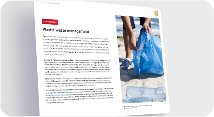 11 | Sustainability Report Highlights Plastics are important to our society and should never end up as litter in our environment. Plastic waste management ExxonMobil shares society’s concern about plastic waste in the environment. Plastics provide significant sustainability benefits versus alternative materials and will continue to play an important role in helping society mitigate greenhouse gas emissions (see sidebar, page 13). They should not end up as litter, either in our oceans or anywhere else in the environment. Industry, governments, nongovernmental organizations and consumers must work collaboratively to encourage appropriate recycling, reuse and recovery of plastic waste. Demand for plastics is increasing around the world at rates greater than GDP, due to the rapid growth in the global middle class and the many benefits that plastics bring to society. For example, plastics help provide for the safe production, distribution and preservation of food and water. They help reduce the weight of automobiles to improve fuel efficiency, which enables consumers to reduce their environmental footprint. And they are critical components to many life-saving products in the medical industry, including facemasks, shields and gowns for medical professionals treating patients with COVID-19 and other medical conditions (see case study, page 34). Plastic waste in the environment is part of a larger issue related to global waste management infrastructure. At least 3 billion people worldwide lack access to formal waste disposal facilities. As a result, a significant amount of solid waste makes its way into the environment. According to a 2018 estimate from the World Bank, about 12 percent of the global municipal solid waste stream is plastic. ExxonMobil is taking action to help address plastic waste in the environment by increasing plastic recyclability and supporting improvements in plastic waste recovery, for example, through our founding membership in the Alliance to End Plastic Waste . We are also working on advanced recycling solutions that create and capture value from plastic waste with opportunities for lower overall greenhouse gas emissions over the full life cycle of the plastic. In addition, minimizing pellet loss from our operations is integral to our commitment to responsible operations. ENVIRONMENT