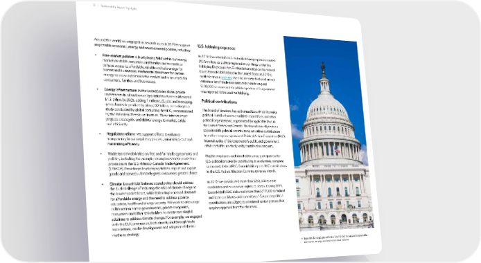 ExxonMobil engages with U.S. lawmakers to support responsible economic, energy and environmental policies. Around the world, we engaged on several issues in 2019 to support responsible economic, energy and environmental policies, including: • Free-market policies: A level playing field within our energy markets is vital if consumers and families are to continue to have access to affordable, reliable and safe energy for homes and businesses. Preferential treatment for certain energy sources undermines the market and raises costs for consumers, families and businesses. • Energy infrastructure: In the United States alone, private investments in oil and natural gas infrastructure could exceed $1.3 trillion by 2035, adding 1 million U.S. jobs and increasing gross domestic product by almost $2 trillion, according to a study conducted by global consulting firm IFC, commissioned by the American Petroleum Institute. These infrastructure projects create jobs and deliver energy to market, safely and efficiently. • Regulatory reform: We support efforts to enhance transparency in our regulatory process, minimizing cost and maximizing efficiency. • Trade: ExxonMobil relies on free and fair trade agreements and policies, including, for example, strong investment protection provisions in the U.S.-Mexico-Canada Trade Agreement (USMCA). Providing a level playing field to import and export goods and services ultimately gives consumers greater choice. • Climate: ExxonMobil believes sound policy should address the dual challenge of reducing the risks of climate change at the lowest societal cost, while balancing increased demand for affordable energy and the need to address poverty, education, health and energy security. We work to encourage collaboration across governments, private companies, consumers and other stakeholders to create meaningful solutions to address climate change. For example, we engaged with the EU Commission, both directly and through trade associations, on the development and adoption of the EU methane strategy. U.S. lobbying expenses In 2019, ExxonMobil’s U.S. federal lobbying expenses totaled $9.75 million, as publicly reported in our filings under the Lobbying Disclosure Act. Further information on the federal issues ExxonMobil lobbied in the United States in 2019 is available on our website . We also recently disclosed on our website a list of trade associations to which we paid $100,000 or more and for which a portion of our payment was reported to be used for lobbying. Political contributions The board of directors has authorized ExxonMobil to make political contributions to candidate committees and other political organizations, as permitted by applicable laws in the United States and Canada. The board annually reviews ExxonMobil’s political contributions, as well as contributions from the company-sponsored Political Action Committee (PAC). Internal audits of the corporation’s public and government affairs activities routinely verify contribution amounts. Eligible employees and shareholders may participate in the U.S. political process by contributing to a voluntary, company sponsored, federal PAC. ExxonMobil reports PAC contributions to the U.S. Federal Election Commission every month. In 2019, we contributed more than $253,000 to state candidates and caucuses in eight U.S. states. During 2019, ExxonMobil’s PAC disbursed more than $719,000 to federal and state candidates and committees. 1 Corporate political contributions are subject to an internal review process that requires approval from the chairman. 33 | Sustainability Report Highlights