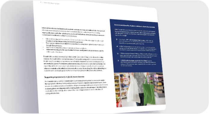 13 | Sustainability Report Highlights Lorem ipsum dolar sit etium apparatus dolar sit etium montrimonii, catherdas sinosous. Advanced recycling involves breaking down plastic waste into its molecular building blocks. This approach effectively transforms plastic waste into the raw materials that are used in the process of making virgin-quality plastic and other valuable products. ExxonMobil believes advanced recycling is a necessary complement to traditional recycling for several reasons: • Advanced recycling enables society to capture more value from a broader range of products and provides more flexibility in sorting and separation processes. • There are no evident technical limitations regarding how many times a plastic product can be put through these processes. • Advanced recycling helps remove contaminants from used plastic. • Advanced recycling provides opportunities for lower overall greenhouse gas emissions over the full life cycle of the plastic. ExxonMobil is working on technology to help enable and accelerate large-scale advanced recycling solutions that could address certain limitations of traditional recycling and do so in an economically feasible way. Leveraging our expertise in research and development and molecule management, we are developing options for integrating advanced recycling solutions at our petrochemical facilities. We expect this will lead to more mixed and soiled plastic waste being recovered and used to make high- value raw materials safely, reliably and economically, at scale. We are doing this without diminishing our commitment to developing products that are easier to recycle via traditional recycling methods. Supporting improvements in plastic waste recovery As economies grow, society’s commitment to waste management systems must expand to enable the appropriate collection, sorting and processing of waste to minimize environmental impact. These infrastructure enhancements are needed for all types of municipal solid waste, not just plastic. However, increasing plastic recycling rates and converting plastic waste into a broad range of valuable products could unlock value and help offset some of the costs of improvements to waste collection and sorting infrastructure. Environmental benefits of plastics relative to alternative materials While ExxonMobil agrees there is no place for plastic waste in the environment, the environmental benefits of plastic are clear. Calls to replace plastic packaging with alternative materials can often have unintended negative environmental impacts. For example: According to a 2011 U.K. Environment Agency study , a cotton tote bag would need to be used 131 times to have a lower full life cycle emissions impact than using a typical plastic grocery bag once. A 2016 TruCost study found that substituting plastic in consumer products packaging with alternatives that perform the same function would have nearly four times the negative impact on the environment on a full life cycle basis. A 2018 study by the Denmark Ministry of Environment and Food concluded a paper bag would need to be reused 43 times to have a lower impact on ozone depletion and air and water pollution than the average plastic bag. A 2018 Franklin Associates study in the United States found the manufacturing process for plastics packaging used almost 50 percent less energy and 80 percent less water compared to the manufacturing process for alternate materials.