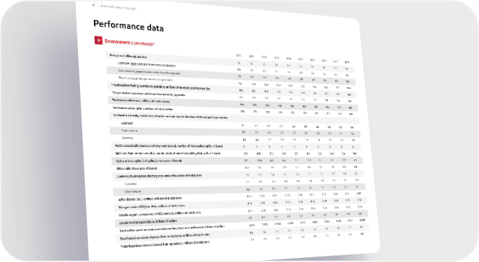 Energy use (billion gigajoules) Upstream (gigajoules per metric tons production) Downstream (gigajoules per metric tons throughput) Chemical (gigajoules per metric tons product) 6 - Hydrocarbon flaring (worldwide activities), millions of standard cubic feet per day 7 Cogeneration capacity in which we have interest, gigawatts Freshwater withdrawn, millions of cubic meters Freshwater consumption, millions of cubic meters Freshwater intensity, metric tons of water consumed per metric tons of throughput or production Upstream Downstream Chemical Marine vessel spills (owned and long-term leased), number of hydrocarbon spills > 1 barrel Spills (not from marine vessels), number of oil, chemical and drilling fluid spills > 1 barrel Hydrocarbons spilled (oil spilled), thousands of barrels Other spills, thousands of barrels Controlled hydrocarbon discharges to water, thousands of metric tons Upstream Downstream Sulfur dioxide (SO 2 ) emitted, millions of metric tons Nitrogen oxides (NO x ) emitted, millions of metric tons Volatile organic compounds (VOCs) emitted, millions of metric tons Environmental expenditures, billions of dollars Total dollars spent on environmental penalties, fines and settlements, billions of dollars Total hazardous waste disposed from remediation, millions of metric tons 8 Total hazardous waste disposed from operations, millions of metric tons 1.5 2.0 3.0 9.5 380 4.9 N/A 330 0.1 0.9 2.4 0 210 7.7 40.4 1.3 1.1 0.2 0.14 0.12 0.17 4.5 0.011 0.6 1.3 2019 2010 1.5 2.0 3.0 11.4 430 5.0 540 370 0.3 0.9 2.6 0 484 17.8 2.0 1.3 1.1 0.2 0.13 0.15 0.18 4.9 0.003 1.3 1.9 2011 1.5 2.0 3.0 12.0 380 5.2 520 330 0.3 0.8 2.4 0 356 8.5 1.6 1.2 1.0 0.2 0.13 0.14 0.15 5.5 0.004 1.7 2.0 2012 1.4 2.1 3.0 10.9 390 5.3 420 280 0.2 0.7 2.0 0 332 9.3 0.9 1.1 1.0 0.1 0.12 0.14 0.15 6.0 0.002 1.1 0.3 2013 1.4 2.3 2.9 10.7 470 5.5 420 270 0.2 0.7 1.8 0 337 9.1 4.1 1.3 1.2 0.1 0.10 0.14 0.16 6.2 0.015 1.0 0.3 2014 1.5 2.4 2.9 10.9 570 5.5 450 300 0.4 0.7 1.8 0 321 10.8 0.4 1.1 1.0 0.1 0.11 0.14 0.16 5.7 0.006 1.4 0.2 2015 1.5 2.4 2.9 10.6 530 5.3 430 280 0.3 0.8 1.8 0 220 4.7 3.7 1.1 1.0 0.1 0.11 0.13 0.15 4.9 0.006 1.4 0.1 2016 1.4 2.5 2.9 10.5 410 5.4 440 290 0.3 0.8 1.8 0 204 6.9 1.8 1.7 1.6 0.1 0.10 0.12 0.14 4.7 0.001 1.5 0.2 1.5 2.5 3.0 10.0 410 5.4 470 310 0.5 0.7 1.8 0 334 11.3 0.8 0.8 0.7 0.1 0.10 0.12 0.16 4.9 0.001 1.1 0.2 1.5 2.5 3.0 10.0 430 5.4 460 290 0.5 0.7 1.8 0 352 7.5 0.6 0.7 0.5 0.1 0.09 0.12 0.15 5.2 <0.001 1.4 0.2 2017 2018 Performance data 40 | Sustainability Report Highlights Environment CONTINUED 2