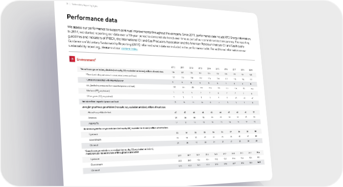 We assess our performance to support continual improvements throughout the company. Since 2011, performance data include XTO Energy information. In 2014, we started reporting our data over a 10-year period to demonstrate trends over time as part of our commitment to transparency. The reporting guidelines and indicators of IPIECA, the International Oil and Gas Producers Association and the American Petroleum Institute Oil and Gas Industry Guidance on Voluntary Sustainability Reporting (2015) informed which data we included in the performance table. For additional information on our sustainability reporting, please visit our content index . Performance data 3 Greenhouse gas emissions, absolute (net equity, CO 2 -equivalent emissions), millions of metric tons 4 Direct (excluding emissions from exported power and heat) 5 Emissions associated with imported power CO 2 (excluding emissions from exported power and heat) Methane (CO 2 -equivalent) Other gases (CO 2 -equivalent) Emissions from exported power and heat By-region greenhouse gas emissions (net equity, CO 2 -equivalent emissions), millions of metric tons Africa/Europe/Middle East Americas Asia Pacific By-division greenhouse gas emissions (net equity, CO 2 -equivalent emissions), millions of metric tons Upstream Downstream Chemical 3 Greenhouse gas emissions, normalized (net equity, CO 2 -equivalent emissions), metric tons per 100 metric tons of throughput or production Upstream Downstream Chemical 126 117 9 122 3 1 13 45 64 17 50 55 21 20.5 20.8 57.9 2019 128 119 9 124 3 1 15 45 66 17 54 54 20 20.7 20.0 57.2 2010 126 118 8 120 5 1 15 44 68 14 56 51 19 22.3 19.6 56.3 2011 127 119 8 119 7 1 16 44 70 13 58 49 20 23.2 19.7 57.9 2012 124 116 8 116 7 1 8 43 66 15 56 47 21 24.0 19.2 54.5 2013 120 111 9 114 6 <1 3 37 66 17 55 42 23 25.4 19.1 52.8 2014 122 114 8 115 6 1 4 44 65 13 56 45 21 25.7 18.9 54.8 2015 125 117 8 117 7 1 3 45 64 16 59 45 21 26.3 19.4 53.9 2016 123 115 8 116 7 <1 3 43 64 16 58 43 22 26.3 18.6 54.2 124 116 8 117 7 <1 3 42 63 19 58 42 24 26.8 18.6 55.5 2017 2018 Environment 2 39 | Sustainability Report Highlights