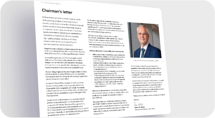 Darren W. Woods Chairman and Chief Executive Officer 4 | Sustainability Report Highlights Darren W. Woods, Chairman and Chief Executive Officer. Chairman’s letter At ExxonMobil, we strive to deliver superior results while providing products and services that are essential to the health and welfare of billions of people around the world. How we achieve these results is as important as the results themselves. That is why we are committed to operating our businesses in a responsible and sustainable manner, supplying high-quality products, working to minimize environmental impacts and supporting the communities where we live and work. These efforts are outlined in our latest Sustainability Report and its companion publication, the Energy & Carbon Summary , which showcases efforts to reduce greenhouse gas emissions. Few would disagree that one of the most urgent societal challenges we face today is addressing the risks of climate change. How we meet the world’s demand for the energy necessary for economic growth while mitigating the long-term impact on our environment is key to our sustainable future. We are making progress in this area through a variety of actions including enhancing energy efficiency across our operations, improving leak detection and repair and increasing cogeneration capacity at manufacturing facilities. As a result of these efforts, we expect to meet our goal to decrease methane emissions by 15 percent and flaring by 25 percent by 2020, compared to 2016 levels. We recently outlined a new five-year plan to further reduce greenhouse gas emissions from our operations in support of the goals of the Paris Agreement. We plan to reduce the intensity of our operated upstream greenhouse gas emissions by 15 to 20 percent by 2025, compared to 2016 levels. This plan will be supported by a 40 to 50 percent decrease in methane intensity, and a 35 to 45 percent decrease in flaring intensity across our global operations. Ultimately, we aim for industry-leading greenhouse gas performance across our businesses by 2030. We also plan to align with the World Bank’s initiative to eliminate routine flaring by 2030 – a continuation of the strict flaring protocols we adopted for our U.S. unconventional operations in 2019 – and we proposed a model regulatory framework for our industry to mitigate methane emissions from new and existing oil and gas operations. The steps we are taking to reduce emissions reflect ExxonMobil’s commitment to addressing the risks of climate change. We also continue to invest in lower-emission technologies, such as carbon capture and advanced biofuels, which are necessary for society to achieve its ambition for net zero emissions by 2050. Other key dimensions of sustainability performance include: • Taking action to help society address plastic waste in the environment by working on advanced recycling solutions and having no reportable plastic pellet losses for two consecutive years; • Achieving a historically low rate of high-consequence injuries, extending a multiyear improvement trend • Increasing representation of women executives by 69 percent since 2009; • Increasing representation of minority executives in the United States by 80 percent since 2009; • Contributing more than $250 million in communities worldwide to address key needs such as health care, disaster relief, education and economic development; • Expanding human rights training with more than 1,800 employees across 49 countries completing training since 2015. These actions demonstrate our commitment to responsibly and sustainably running our businesses and the resilience and excellence of our people who respond and adapt to new challenges. That adaptability was critically important in responding to the COVID-19 global pandemic. I am proud of the way our company and our people delivered assistance to governments, health care personnel and first responders around the world while safely providing an uninterrupted supply of vital energy products. We boosted production of isopropyl alcohol, the key ingredient in hand sanitizer, and polypropylene, critical for the manufacture of medical masks and surgical gowns. One of our U.S. manufacturing facilities even temporarily reconfigured its operations to directly manufacture hand sanitizer to meet increased demand. Further details on our response to the pandemic, our overall sustainability efforts and our work to manage the risks of climate change are included in our Sustainability Report and Energy & Carbon Summary . I hope you find these reports useful and informative in understanding more about ExxonMobil’s positive contribution to society. Thank you for your interest, and we welcome your feedback. Sincerely,