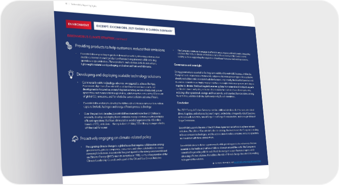 ENVIRONMENT EXCERPT: EXXONMOBIL 2021 ENERGY & CARBON SUMMARY 10 | Sustainability Report Highlights For more information, visit exxonmobil.com/energycarbonsummary . • The Company continues to engage in efforts to encourage sound and constructive policy solutions that reduce climate-related risks across the economy at the lowest cost to society, such as supporting the regulation of methane from new and existing sources. • ExxonMobil is responding to product demand growth by delivering solutions that enable customers to meet product performance requirements while reducing greenhouse gas emissions. These products and solutions include: natural gas, lightweight materials and packaging, and advanced fuels and lubricants. • Recognizing climate change is a global issue that requires collaboration among governments, private companies, consumers and other stakeholders to create meaningful solutions, ExxonMobil has participated in the Intergovernmental Panel on Climate Change (IPCC) since its inception in 1988, is a founding member of the Climate Leadership Council, and is part of the Oil and Gas Climate Initiative. • Commercially viable technology advances are required to achieve the Paris Agreement objectives. ExxonMobil’s sustained investment in research and development is focused on society’s highest-emitting sectors of industrial, power generation and commercial transportation, which together account for 80 percent of global CO 2 emissions, and for which the current solution set is insufficient. • ExxonMobil is working to develop breakthrough solutions in areas such as carbon capture, biofuels, hydrogen and energy-efficient process technology. • Over the past two decades, ExxonMobil has invested more than $10 billion to research, develop and deploy lower-emission energy solutions, resulting in highly efficient operations that have eliminated or avoided approximately 480 million tonnes of CO 2 emissions – the equivalent of taking 100 million passenger vehicles off the road for a year. Providing products to help customers reduce their emissions Proactively engaging on climate-related policy Developing and deploying scalable technology solutions EXXONMOBIL’S CLIMATE STRATEGY, continued Governance and oversight Strong governance is essential to the long-term viability of ExxonMobil’s business. Within the Company’s robust governance framework, a rigorous risk-management approach is applied to identify and address risks associated with the business. Importantly, the Board of Directors and its various committees are highly engaged and have oversight of risk management, including as it applies to climate. The Board regularly receives updates from internal and third-party experts on climate science and policy, evaluates climate risk in the context of overall enterprise risk, including other operational, strategic and financial risks, and considers the interactions among these factors, which includes in-depth analyses by Board committees. Conclusion The 2021 Energy & Carbon Summary contains additional detail on all of the areas described above. It updates and enhances last year’s report, and includes a Frequently Asked Questions section as well as metrics, annual Scope 1 and Scope 2 emission data, and a new provision of Scope 3 emissions. ExxonMobil supports the aims of the 2015 Paris Agreement and efforts to achieve net-zero emissions. The pillars of ExxonMobil’s climate strategy, the investments the Company is making in lower-emission technologies, and the actions taken to reduce emissions across its operations are consistent with these global efforts. ExxonMobil strives to deliver superior results while providing products and services that are essential to the health and welfare of billions of people around the world. The Company is committed to providing reliable and affordable energy to support human progress while advancing effective solutions that address the risks of climate change. ExxonMobil is working to be part of the solution.