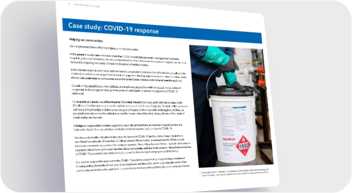 Case study: COVID-19 response During the COVID-19 pandemic, our employees worked safely to help keep vital energy and products flowing, including isopropyl alcohol, a key ingredient in many disinfectant products. 37 | Sustainability Report Highlights Helping our communities We complemented these efforts by helping our local communities. In the greater Houston area – home to more than 10,000 ExxonMobil personnel – we supported food banks, hospitals, police and firefighters. We also partnered with the Texas Restaurant Association to support hard-hit, local restaurants preparing thousands of meals for donation to frontline workers. In the Permian region in West Texas and New Mexico, we provided assistance to local food banks, as well as to the Carlsbad, New Mexico, Municipal School District to support technology improvements for online education. Similar efforts were undertaken in communities across the United States where ExxonMobil employees live and work. Outside of the United States, many affiliates and employees around the world contributed money, technical equipment, fuel, isopropyl alcohol, specialty products and logistics assistance to support local COVID-19 relief work. For example, in Canada, our affiliate Imperial Oil Limited offered 80,000 Esso and Mobil fuel vouchers worth $2 million to frontline nurses, paramedics and doctors as part of its Heroes Campaign. Our India affiliate partnered with United Way Mumbai to deliver protective gear to hospitals in Mumbai, Delhi and Bangalore. In China, we provided lubricants needed for ambulances and the construction of hospitals, along with tens of thousands of masks and protective suits. In Belgium, we provided monetary support to major clinical trial efforts at University Hospital Antwerp and University Hospital Leuven, which researched potential treatments and a vaccine for COVID-19. We also worked with authorities to help slow the spread of COVID-19. In Papua New Guinea, for instance, we offered our network of more than 50 Village Liaison Officers to help government health officials provide information in remote areas where the company operates. These Village Liaison Officers – typically clan leaders or councilors who inform community members about our activities and hear local concerns – helped raise awareness of COVID-19 prevention and safety measures, as well as how to implement proper social distancing. Our work to support the response to the COVID-19 pandemic was part of our long-standing commitment to safeguarding the health and security of our employees and the public, and to supporting the needs of the communities in which we live and work – a commitment we have embraced throughout our company’s history.