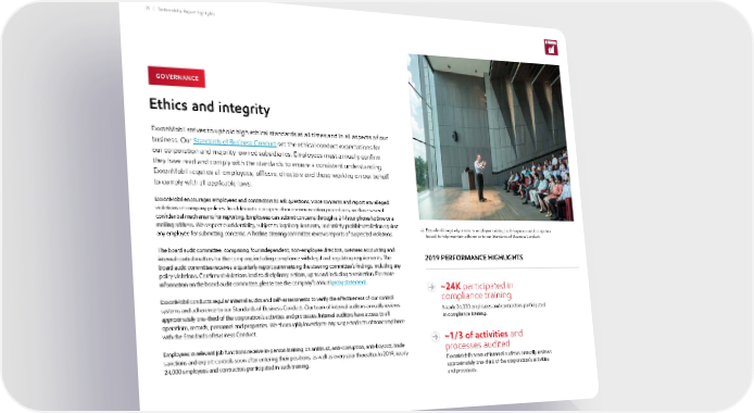 29 | Sustainability Report Highlights Ethics and integrity ExxonMobil strives to uphold high ethical standards at all times and in all aspects of our business. Our Standards of Business Conduct set the ethical conduct expectations for our corporation and majority-owned subsidiaries. Employees must annually confirm they have read and comply with the standards to ensure a consistent understanding. ExxonMobil requires all employees, officers, directors and those working on our behalf to comply with all applicable laws. ExxonMobil encourages employees and contractors to ask questions, voice concerns and report any alleged violations of company policies. In addition to our open-door communication procedures, we have several confidential mechanisms for reporting. Employees can submit concerns through a 24-hour phone hotline or a mailing address. We respect confidentiality, subject to legal requirements, and strictly prohibit retaliation against any employee for submitting concerns. A hotline steering committee reviews reports of suspected violations. The board audit committee, comprising four independent, non-employee directors, oversees accounting and internal control matters for the company, including compliance with legal and regulatory requirements. The board audit committee receives a quarterly report summarizing the steering committee’s findings, including any policy violations. Confirmed violations lead to disciplinary actions, up to and including termination. For more information on the board audit committee, please see the company’s annual proxy statement . ExxonMobil conducts regular internal audits and self-assessments to verify the effectiveness of our control systems and adherence to our Standards of Business Conduct. Our team of internal auditors annually reviews approximately one-third of the corporation’s activities and processes. Internal auditors have access to all operations, records, personnel and properties. We thoroughly investigate any suspected acts of noncompliance with the Standards of Business Conduct. Employees in relevant job functions receive in-person training on antitrust, anti-corruption, anti-boycott, trade sanctions and export controls soon after entering their positions, as well as every year thereafter. In 2019, nearly 24,000 employees and contractors participated in such training. GOVERNANCE 29 | Sustainability Report Highlights ExxonMobil regularly conducts employee training, both in-person and computer- based, to help maintain adherence to our Standards of Business Conduct. 2019 PERFORMANCE HIGHLIGHTS ~24K participated in compliance training Nearly 24,000 employees and contractors participated in compliance training. ~1/3 of activities and processes audited ExxonMobil’s team of internal auditors annually reviews approximately one-third of the corporation’s activities and processes.