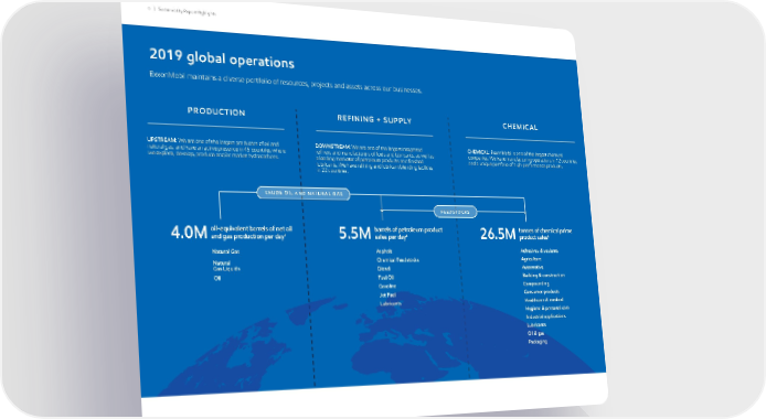 4.0M PRODUCTION Natural Gas Natural Gas Liquids Oil UPSTREAM: We are one of the largest producers of oil and natural gas, and have an active presence in 45 countries where we explore, develop, produce and/or market hydrocarbons. 5.5M REFINING + SUPPLY Asphalt Chemical Feedstocks Diesel Fuel Oil Gasoline Jet Fuel Lubricants DOWNSTREAM: We are one of the largest integrated refiners and manufacturers of fuels and lubricants, as well as a leading marketer of petroleum products and finished lubricants. We have refining and lubricant blending facilities in 22 countries. 26.5M CHEMICAL Adhesives & sealants Agriculture Automotive Building & construction Compounding Consumer products Healthcare & medical Hygiene & personal care Industrial applications Lubricants Oil & gas Packaging CHEMICAL : ExxonMobil is one of the largest chemical companies. We have manufacturing operations in 12 countries and a unique portfolio of high-performance products. CRUDE OIL AND NATURAL GAS FEEDSTOCKS oil-equivalent barrels of net oil and gas production per day † barrels of petroleum product sales per day ‡ tonnes of chemical prime product sales ‡ ExxonMobil maintains a diverse portfolio of resources, projects and assets across our businesses. 2019 global operations 6 | Sustainability Report Highlights