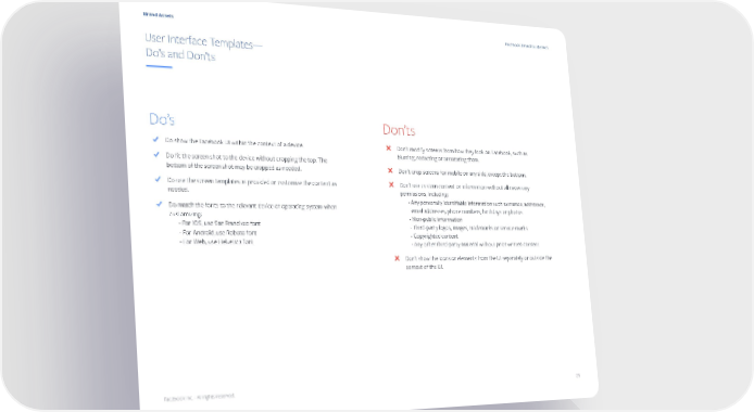Brand Assets Facebook Brand Guidelines User Interface Templates— Do’s and Don’ts Do’s Don’ts % Do show the Facebook UI within the context of a device. - Don’t modify screens from how they look on Facebook, such as % Do fit the screen shot to the device without cropping the top. The blurring, redacting or annotating them. bottom of the screen shot may be cropped as needed. - Don’t crop screens for mobile on any side, except the bottom. % Do use the screen templates as provided or customize the content as - Don’t use custom content or information without all necessary needed. permissions, including: % Do match the fonts to the relevant device or operating system when - Any personally identifiable information such as names, addresses, customizing: email addresses, phone numbers, birthdays or photos - For iOS, use San Francisco font - Non-public information - For Android, use Roboto font - Third-party logos, images, trademarks or service marks - For Web, use Helvetica font - Copyrighted content - Any other third-party material without prior written consent - Don’t show the icons or elements from the UI separately or outside the context of the UI. Facebook Inc. - All rights reserved. 25