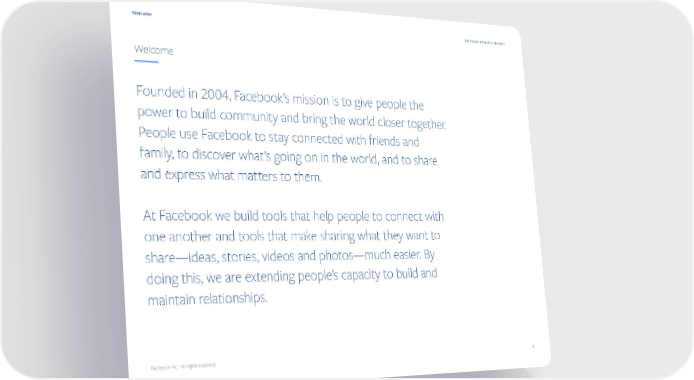 Welcome Facebook Brand Guidelines Welcome Founded in 2004, Facebook’s mission is to give people the power to build community and bring the world closer together. People use Facebook to stay connected with friends and family, to discover what’s going on in the world, and to share and express what matters to them. At Facebook we build tools that help people to connect with one another and tools that make sharing what they want to share—ideas, stories, videos and photos—much easier. By doing this, we are extending people’s capacity to build and maintain relationships. Facebook Inc. - All rights reserved. 4