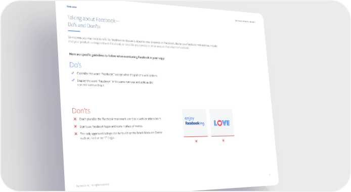 Welcome Facebook Brand Guidelines Talking about Facebook— Do’s and Don’ts Sometimes you may need to refer to Facebook to discuss it, describe your presence on Facebook, display your Facebook web address, indicate that your product is integrated with Facebook, or describe your products or services as they relate to Facebook. Here are specific guidelines to follow when mentioning Facebook in your copy: Do’s % Capitalize the word “Facebook,” except when it’s part of a web address. % Display the word “Facebook” in the same font size and style as the content surrounding it. Don’ts - Don’t pluralize the Facebook trademark, use it as a verb or abbreviate it. enjoy - Don’t use Facebook logos and icons in place of words. ing l ve - The only approved lockups can be found on the Brand Resource Center such as, Find us on “f” Logo. - - Facebook Inc. - All rights reserved. 7