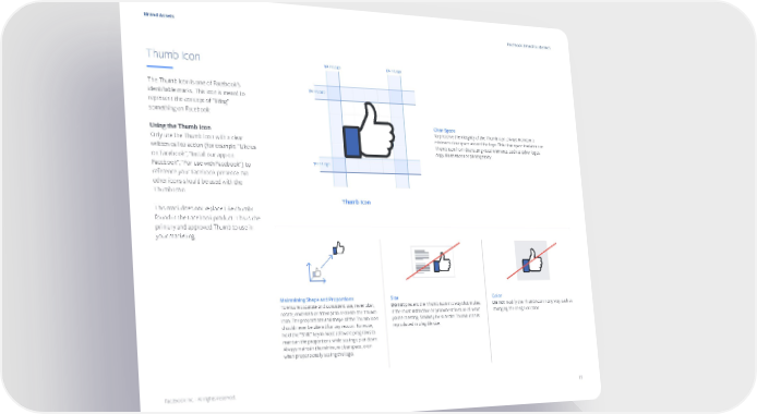 Brand Assets Facebook Brand Guidelines Thumb Icon 1/4 H Logo 1/4 H Logo The Thumb Icon is one of Facebook’s 1/4 H Logo identifiable marks. This icon is meant to represent the concept of “liking” something on Facebook. Clear Space Using the Thumb Icon To preserve the integrity of the Thumb Icon, always maintain a Only use the Thumb Icon with a clear minimum clear space around the logo. This clear space insulates our written call to action (for example: “Like us Thumb Icon from distracting visual elements, such as other logos, copy, illustrations or photography. on Facebook”, “Install our app on Facebook”, “For use with Facebook”) to 1/4 H Logo reference your Facebook presence. No other icons should be used with the Thumb Icon. Thumb Icon This mark does not replace Like thumbs found in the Facebook product. This is the primary and approved Thumb to use in your marketing. Maintaining Shape and Proportions Size Color To ensure accurate and consistent use, never alter, Do not present the Thumb Icon in a way that makes Do not modify the Thumb Icon in any way, such as rotate, embellish or attempt to recreate the Thumb it the most distinctive or prominent feature of what changing the design or color. Icon. The proportions and shape of the Thumb Icon you’re creating. Similarly, be sure the Thumb Icon is should never be altered for any reason. To resize, reproduced in a legible size. hold the “Shift” key in most software programs to maintain the proportions while scaling up or down. Always maintain the minimum clear space, even when proportionally scaling the logo. Facebook Inc. - All rights reserved. 13