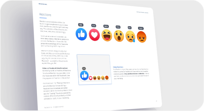 Brand Assets Facebook Brand Guidelines Reactions Reactions are an extension of the Like Like Love Haha Wow Sad Angry Button to give people more ways to share their reaction to a post in a quick and easy way. The collection of Reactions includes Like, Love, Haha, Wow, Sad and Angry. To ensure accurate and consistent use, never alter, rotate, embellish or attempt to recreate the Reactions. Never alter the proportions and shape of the Reactions (and surrounding UI) for any reason. Reactions are not emojis or individual icons, and they cannot be used in this way. It’s important to show Reactions in the way they are intended to be used on Facebook—as a quick and easy way to express how you feel. Video or Facebook Live Broadcast Like Using Reactions We don’t provide animations of Reactions. Use Reactions only as they appear and exactly how they function To include Reactions in your video, show within the context of Facebook UI. Reactions cannot be used for the Reactions within the Facebook UI as creative purposes. Only use Reactions as a collection—do not they appear and function in the product. use them as individual icons or as the most prominent feature of your marketing. Facebook Live: The “floating” Reactions are only intended for use during a Facebook Live broadcast and other instances within Facebook products. Don’t use the “floating” Reactions outside the context of Facebook products, whether animated or static, in your marketing. Facebook Inc. - All rights reserved. 17
