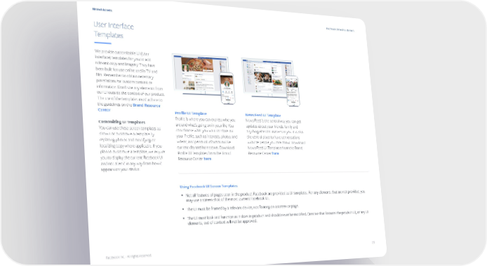Brand Assets Facebook Brand Guidelines User Interface Templates We provide customizable UI (User Interface) templates for you to add relevant copy and imagery. They have been built for use online and in TV and film. Remember to obtain necessary permissions for custom content or information. Don’t use any elements from our UI outside the context of our product. The use of the templates must adhere to the guidelines on the Brand Resource Center. Profile UI Template News Feed UI Template Profile is where you can express who you News Feed is the central way you can get Customizing UI Templates are and what’s going on in your life. You updates about your friends, family and You can use these screen templates as can choose what you want to share on anything else that matters to you. It is also shown or customize a template by your Profile, such as interests, photos and the central place to have conversations replacing photos and modifying or videos, and personal information like with the people you care about. Download localizing copy where applicable. If you current city and hometown. Download News Feed UI Templates from the Brand plan to customize a template, we require Profile UI Templates from the Brand Resource Center here. you to display the current Facebook UI Resource Center here. and not alter it in any way from how it appears on your device. Using Facebook UI Screen Templates y Not all features of pages seen in the product Facebook are provided as UI templates. For any elements that are not provided, you may use a screen shot of the most current Facebook UI. y The UI must be framed by a relevant device, not floating on a screen or page. y The UI must look and function as it does in product and should never be modified. Creative that features the product UI, or any UI elements, out of context will not be approved. Facebook Inc. - All rights reserved. 23